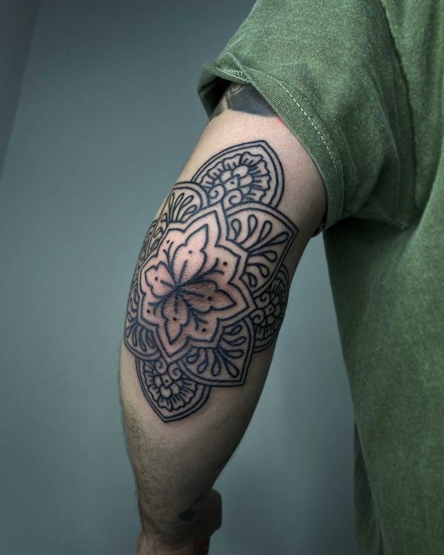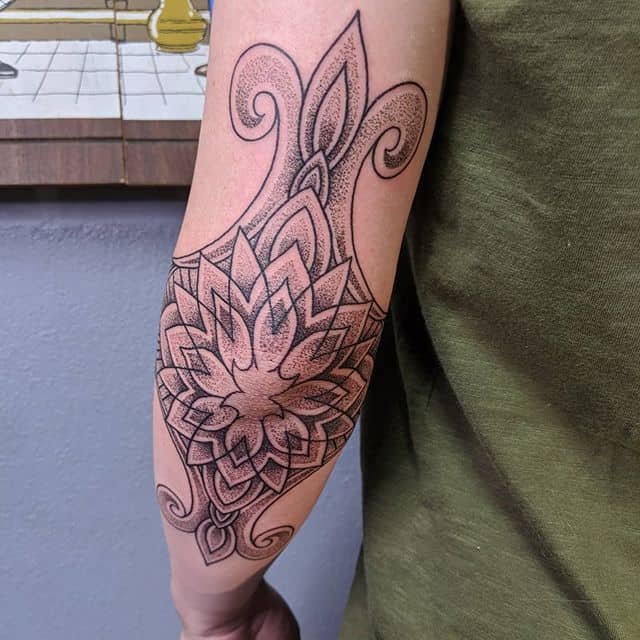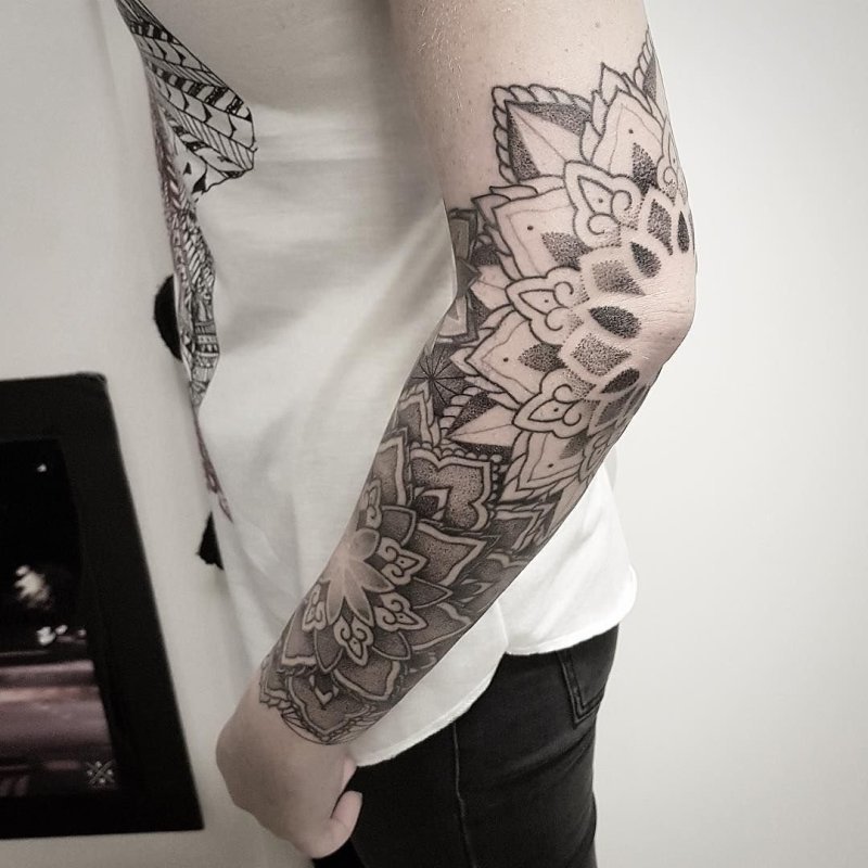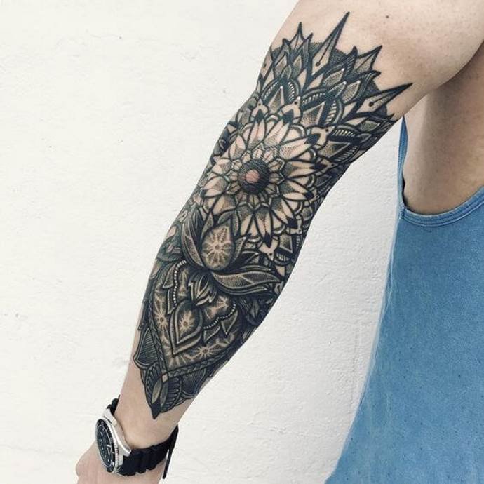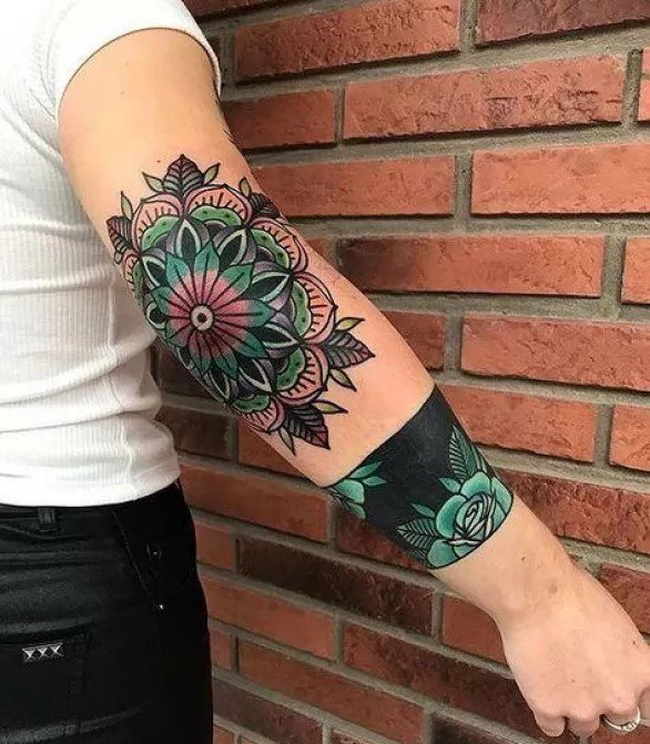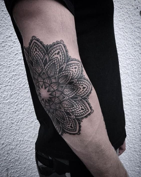 - Мандалы, олицетворяющие духовную составляющую человека, цикличность всего во вселенной, равновесие и единение, прекрасно подойдут на локте.
