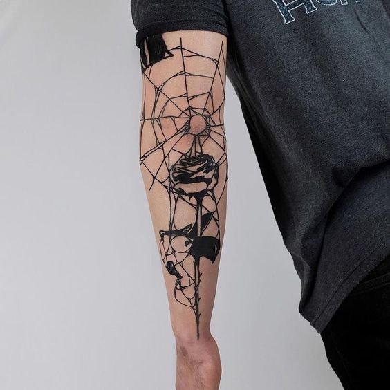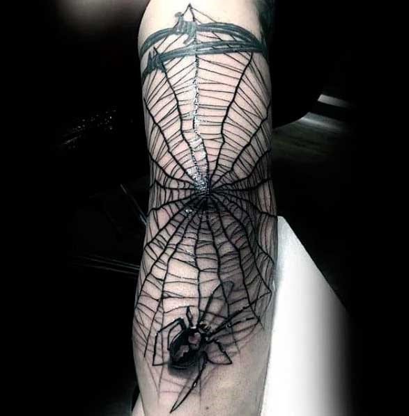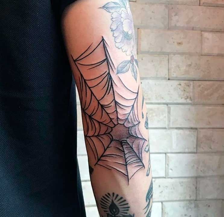 - Паутина - классика мужских тату на локте. Ее интерпретации очень отличаются, не в последнюю очередь от выбранного дизайна и цветов. Этот образ может отражать сложность и многообразие жизни, непредсказуемость выбранных путей и их взаимосвязь. Паутина также может указывать на союз с другими людьми и на то, как мы влияем друг на друга.