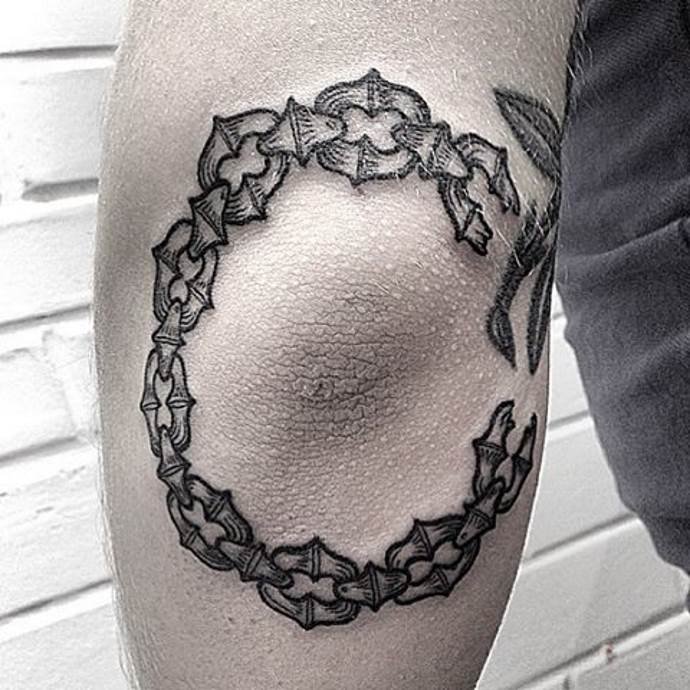 - Круглая металлическая цепь с шипами или колючая проволока - еще один классический образ, являющийся ярким проявлением брутализма. Значение отличается в зависимости от владельца. Однако наиболее распространенными являются такие идеи: целостность, единство, взаимосвязь. Иногда цепь выражает зависимость, напоминает о сложных отношениях, болезни. Изображение же разорванной или надтреснутой цепи нивелирует все негативные значения.