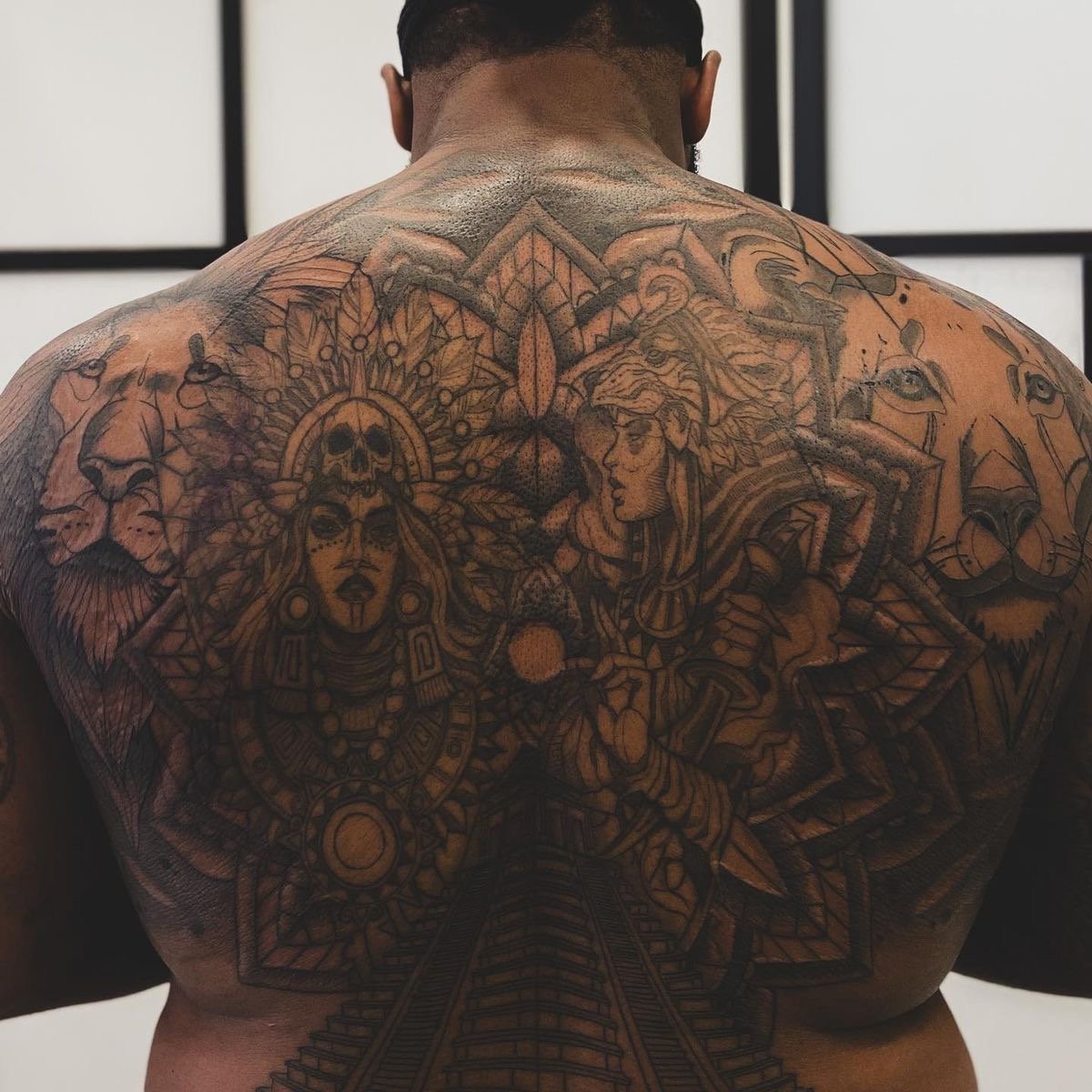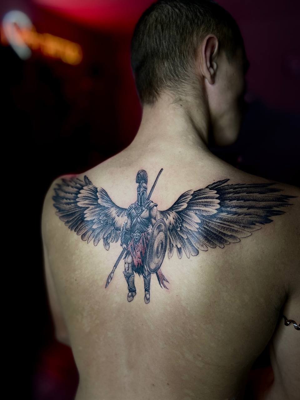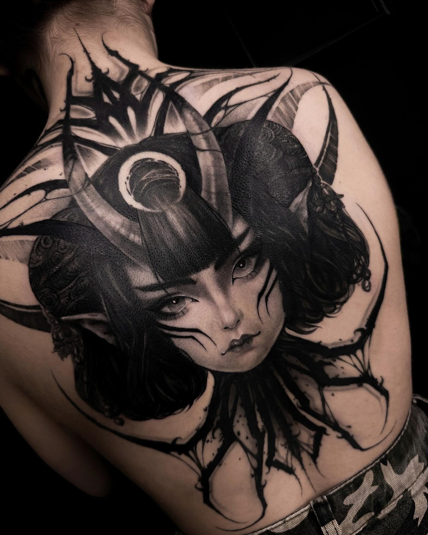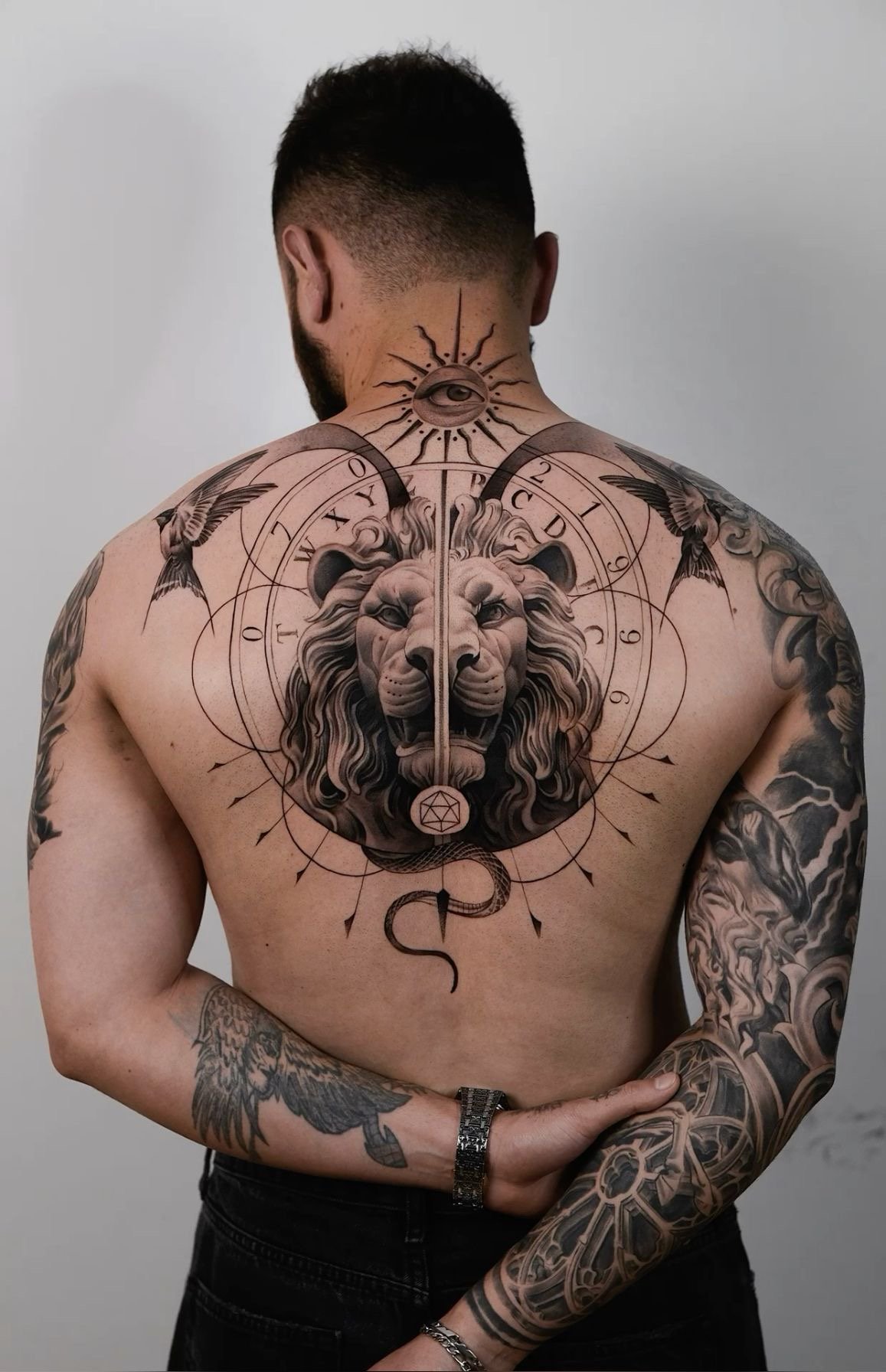 Мужская спина — идеальное место для масштабных тату, обеспечивающее мастеру воплотить детализированные и выразительные идеи, особенно в подходящих стилях.