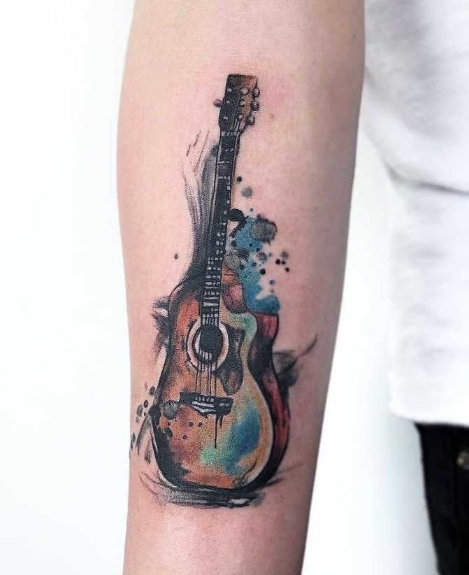 Гитара – знак любви к музыке. В зависимости от вида гитары можно угадать музыкальные пристрастия владельца. Акустическая гитара указывает на увлечение авторской песней, электрогитара означает симпатию к композициям в стиле рок. Нательный рисунок в виде гитары также символизирует душевное равновесие и внутреннюю гармонию. Изображение акустической гитары часто выбирают романтичные натуры, которые склонны идеализировать чувства и отношения.