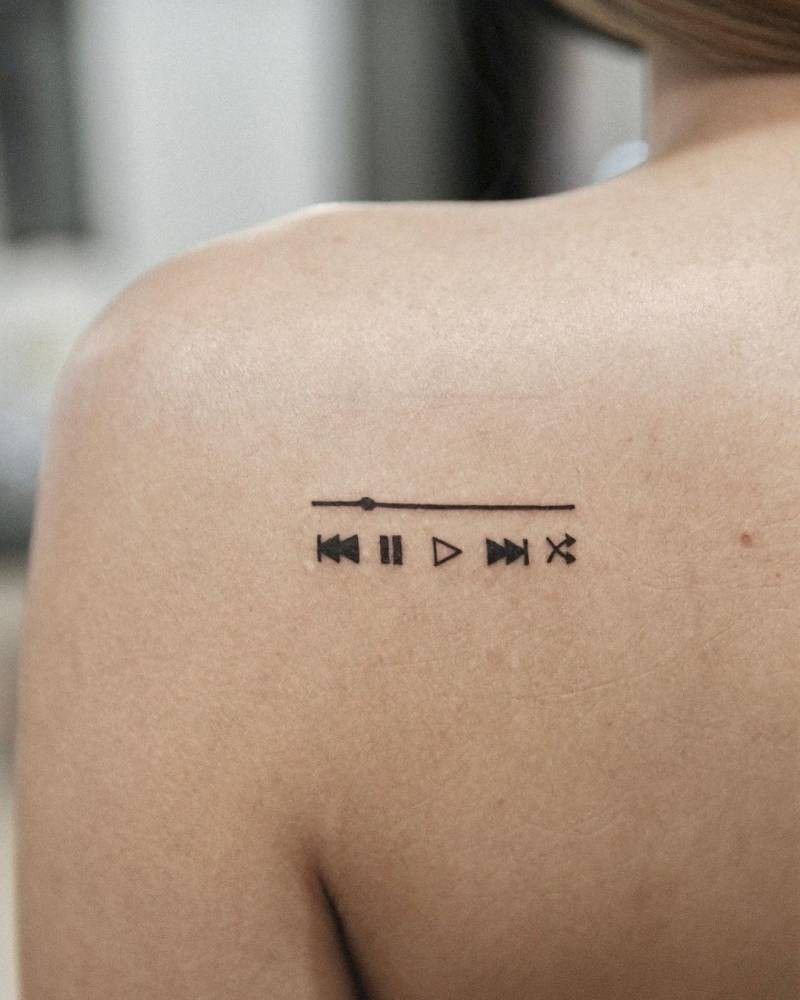 Нательный рисунок в виде кнопок воспроизведения музыки на смартфоне или бумбоксе означает самоконтроль и стремление к порядку. Изображение символизирует целостную, уверенную в себе личность, которая осознанно принимает решения и воплощает планы в реальность.