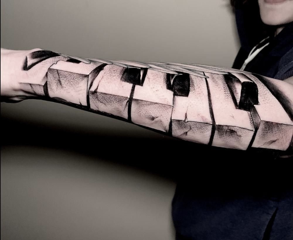 Клавиши пианино – популярный дизайн, который кроме увлечения музыкой показывает философское отношение к жизни. Чередующиеся черные и белые клавиши ассоциируются с удачными и тяжелыми моментами жизни. Выбирайте эскиз, чтобы продемонстрировать стойкость характера, умение справляться с неприятностями и терпеливо ждать лучших времен.
