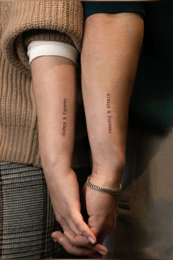 Важно: Мастера не рекомендуют делать татуировки имен возлюбленных или даты, так как жизнь непредсказуема и часто преподносит сюрпризы. Возможно, пару впереди ждет разлука, а татуировка останется неприятным воспоминанием о замужестве или женитьбе. Лучше при выборе эскиза остановить свой выбор на нейтральных рисунках, которые вместе несут собой глубокую символическую нагрузку, а по отдельности могут восприниматься как аккуратный, нейтральный рисунок.