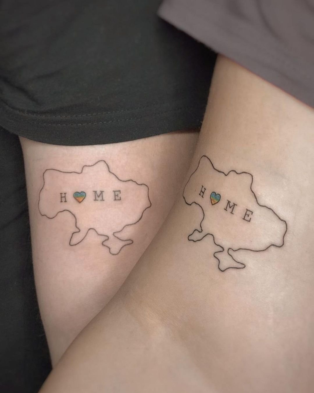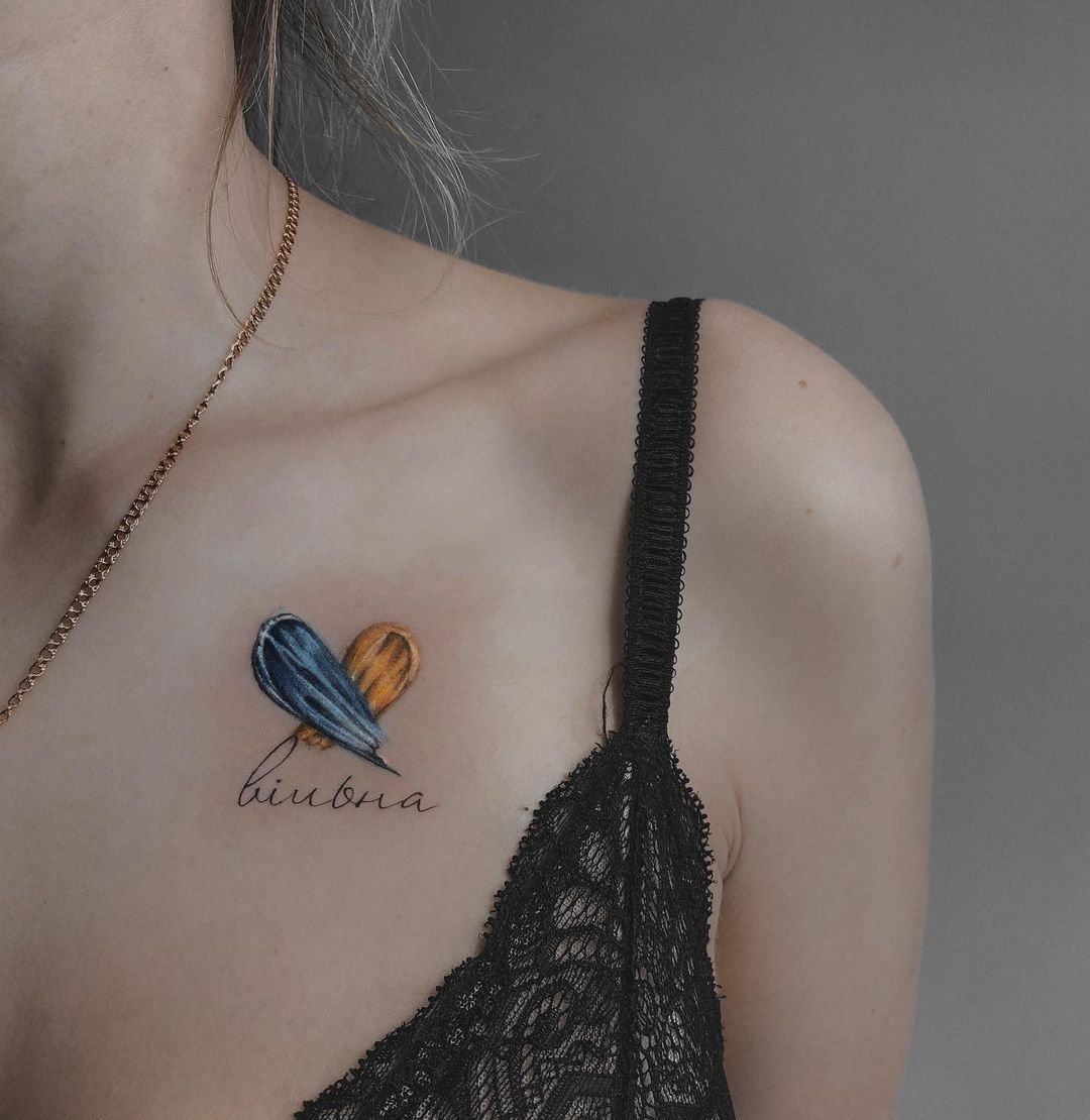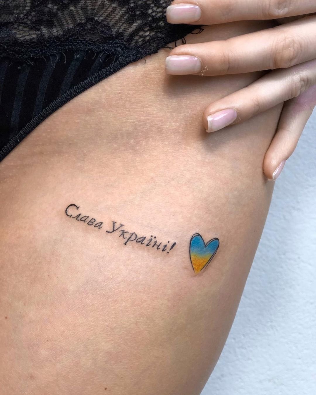 Такие татуировки можно сегодня увидеть на фото звезд и обычных украинок. Многие девушки выбирают для тату каллиграфические патриотические надписи, цитаты из украинских стихов и песен. Чаще всего набивают «вільна», «незламна» на разных языках. Высокий запрос на тату в форме разбитого сердца. Выбирая этот рисунок, девушка хочет показать, что ее душа болит за родительский дом, семью, Украину.
