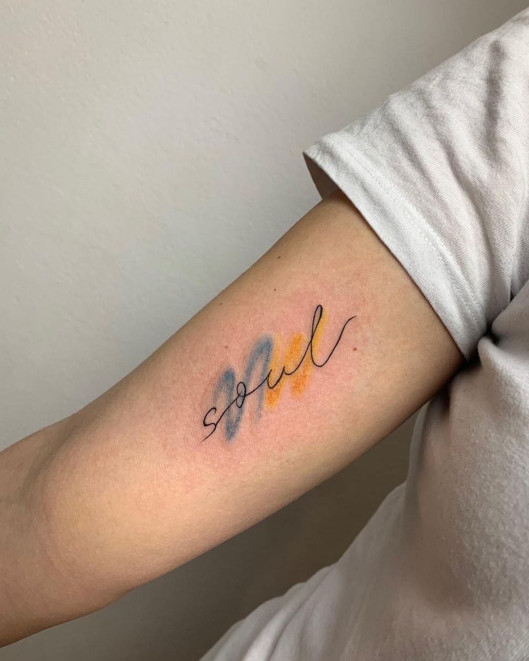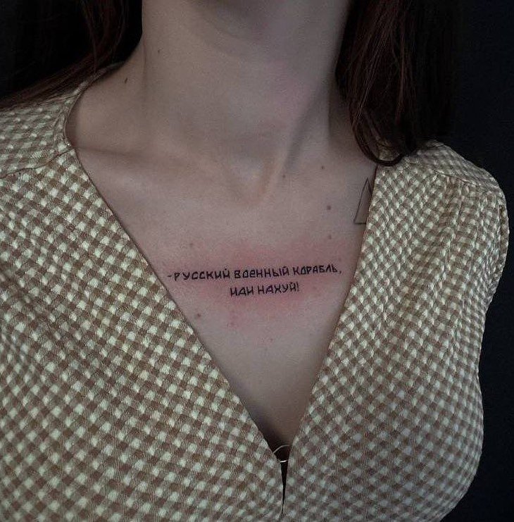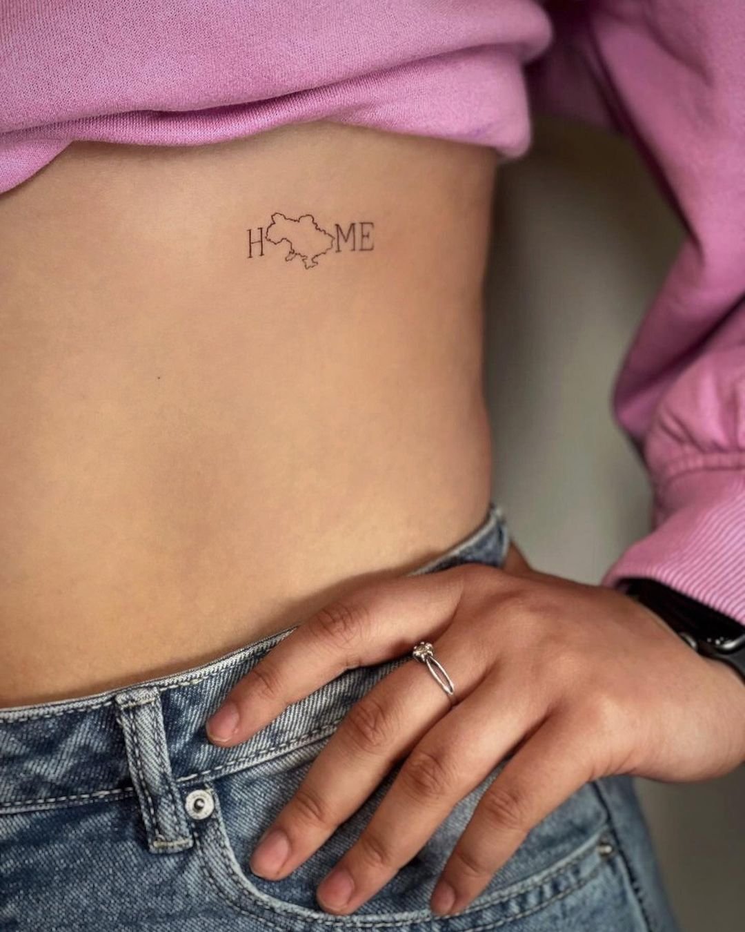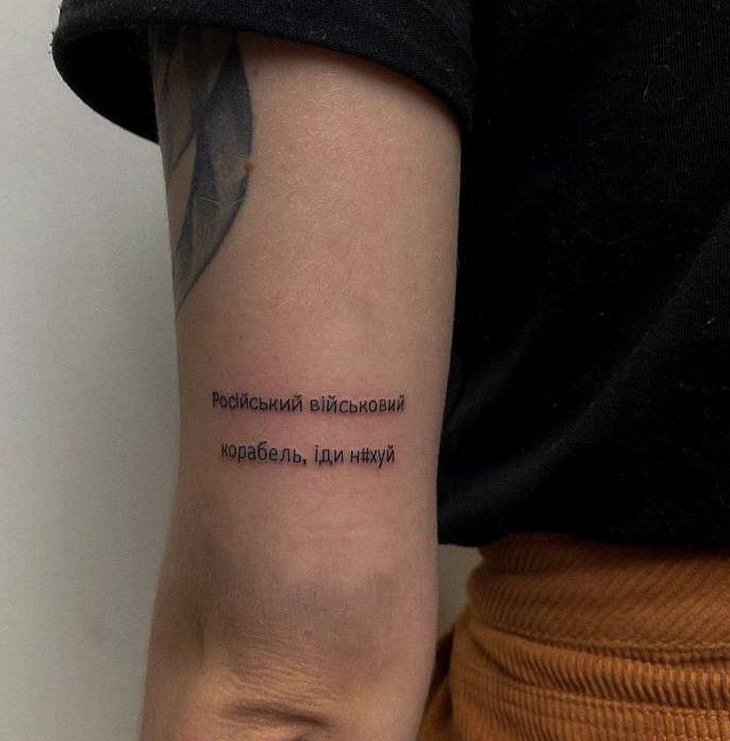 Такие татуировки можно сегодня увидеть на фото звезд и обычных украинок. Многие девушки выбирают для тату каллиграфические патриотические надписи, цитаты из украинских стихов и песен. Чаще всего набивают «вільна», «незламна» на разных языках. Высокий запрос на тату в форме разбитого сердца. Выбирая этот рисунок, девушка хочет показать, что ее душа болит за родительский дом, семью, Украину.