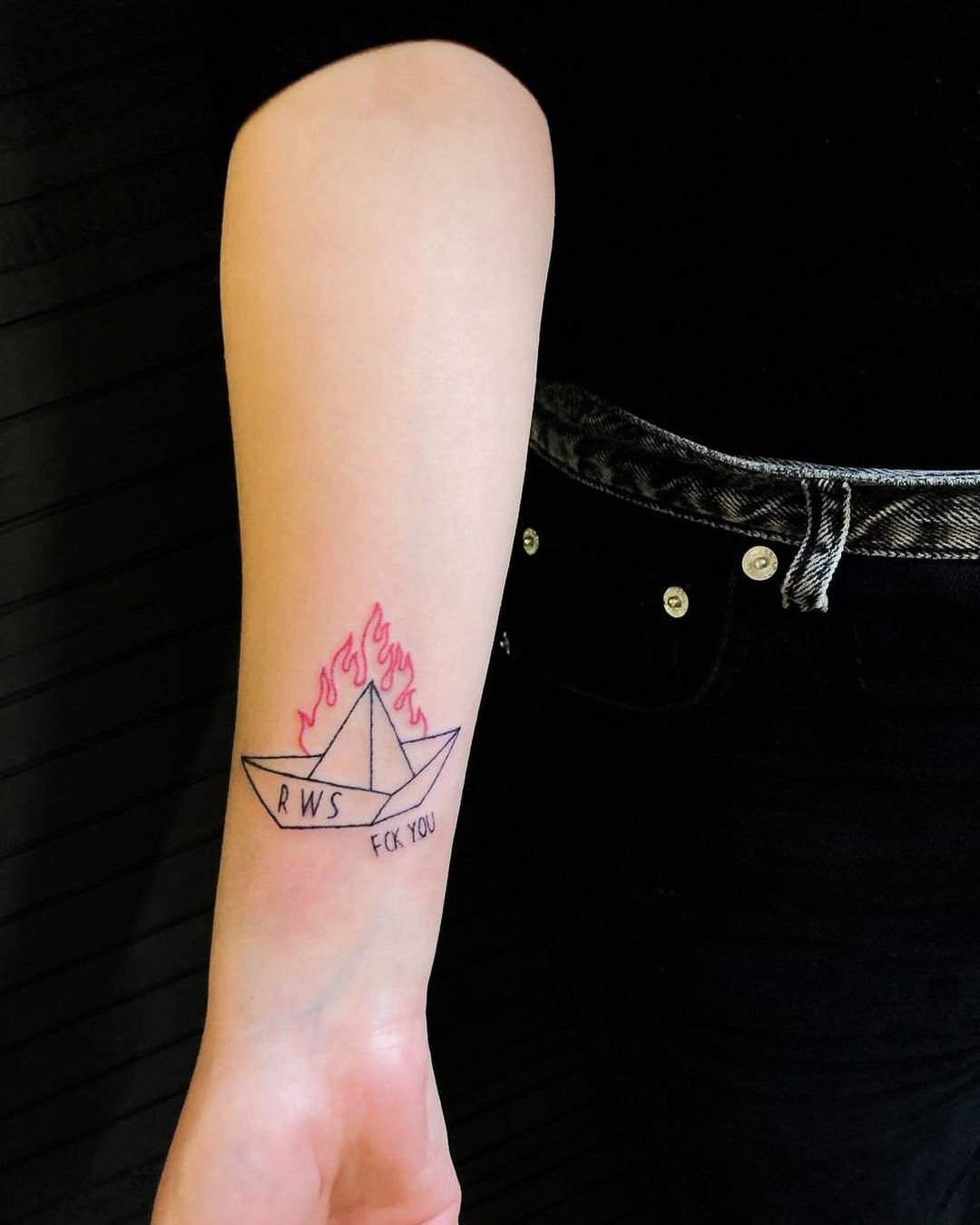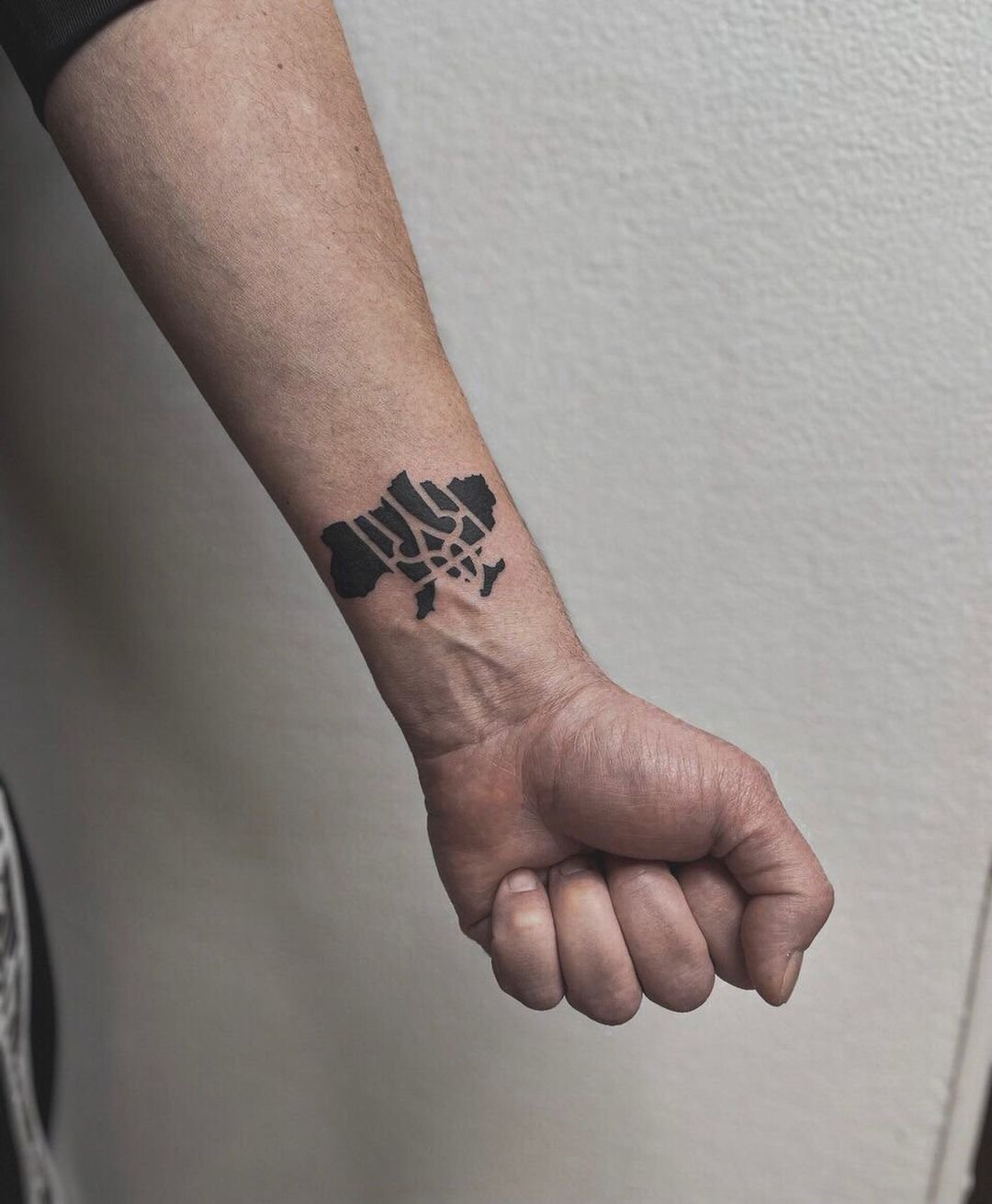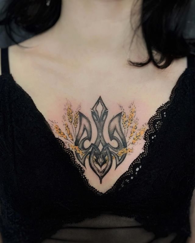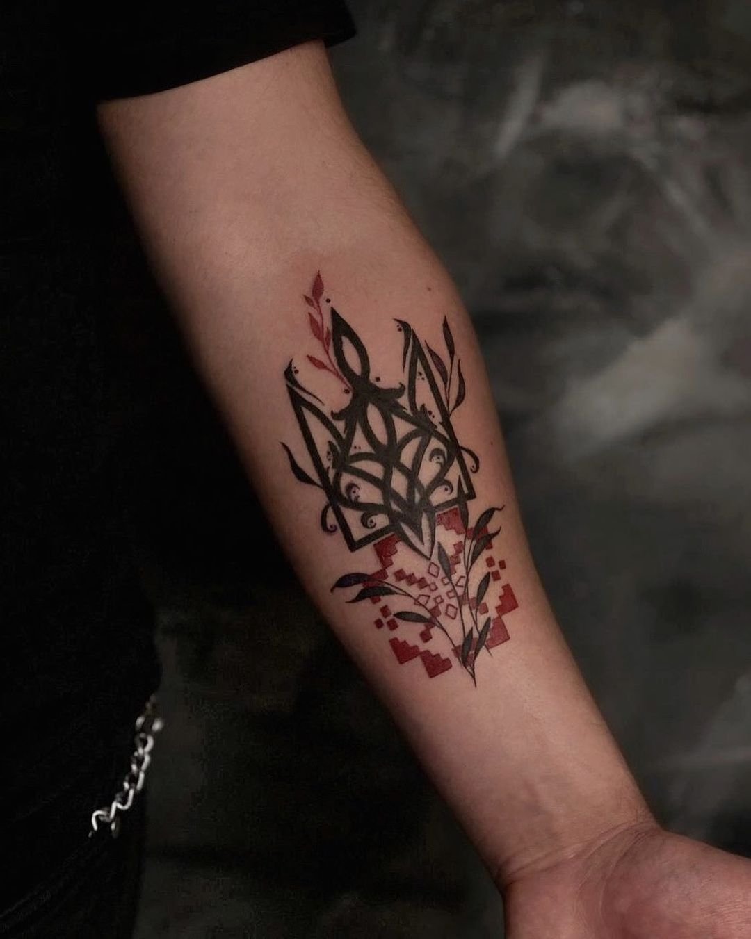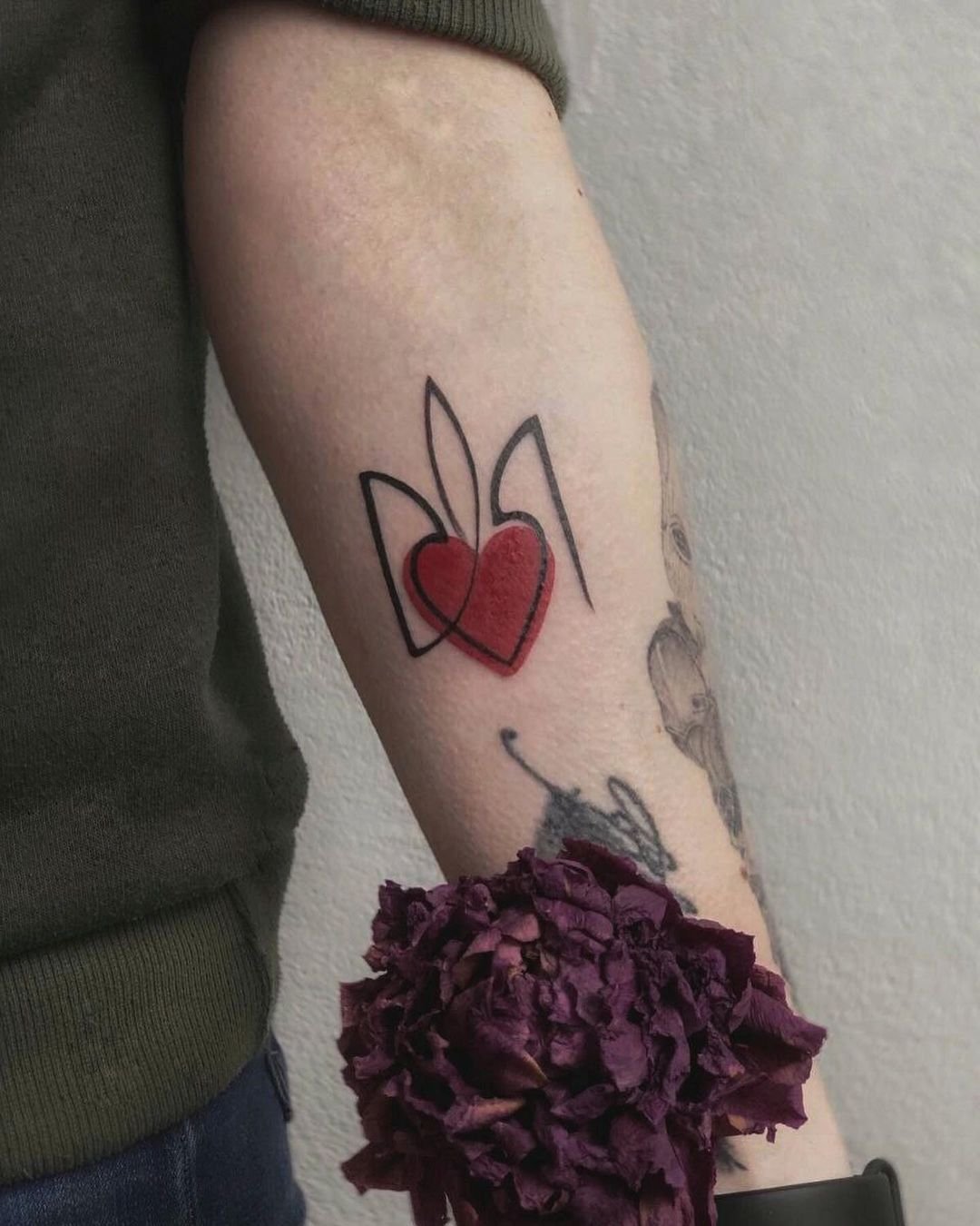 - Герб Украины как тату говорит о том, что человек отдан своему государству, он будет бороться за свободу и независимость до конца. Татуировку с трезубцем можно произвести на любой части тела. Чаще всего выбирают запястье и область груди рядом с сердцем.