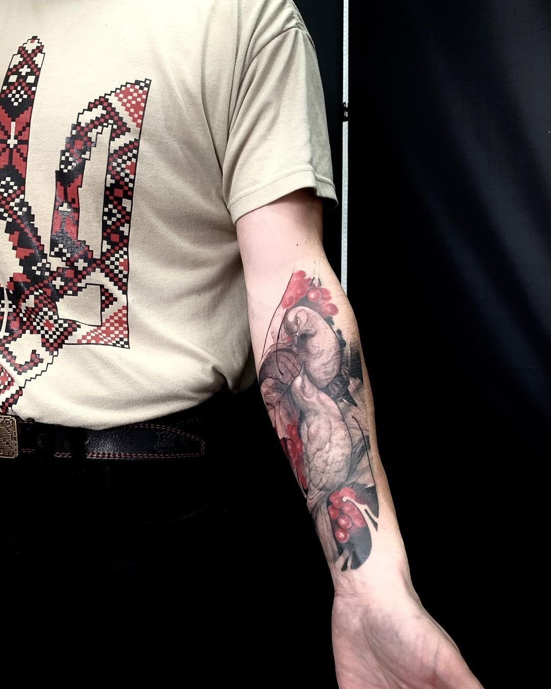Ребята чаще набивают портреты запорожских воинов – украинское казачество сейчас очень актуально. Мужчины, собирающиеся на оборону родной Украины, нередко выбирают орнамент вышиванки. Ее наносят на грудь, поскольку верят в ее защитные свойства. «Моє татуювання як броня. Ворожа куля чи уламок снаряда в мене не потрапить».