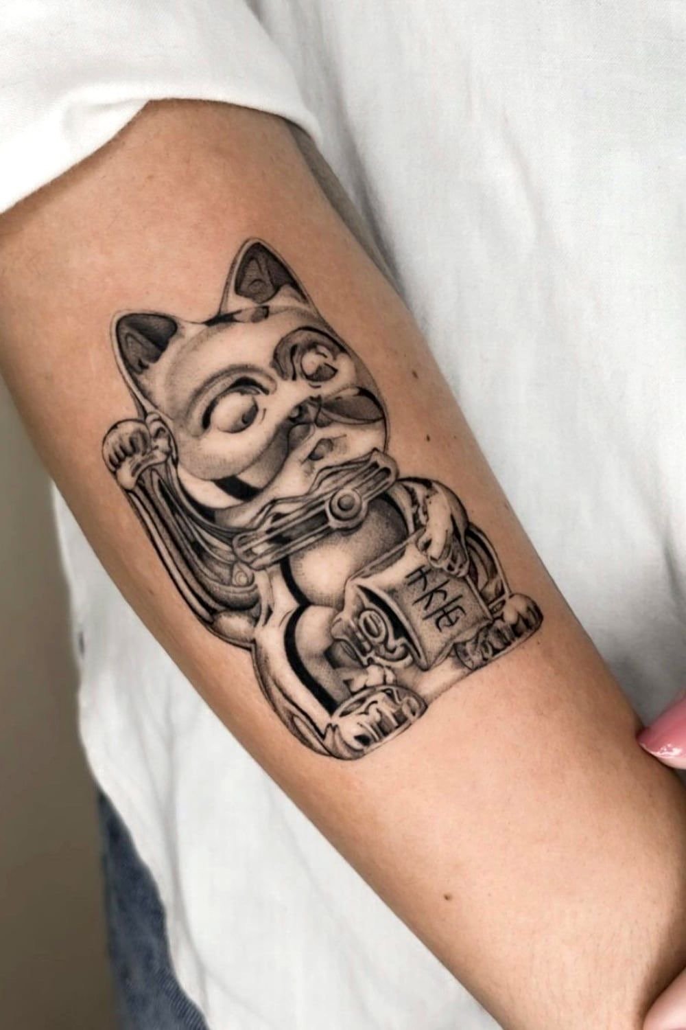 - Согласно японской мифологии, кошка, поднявшая вверх переднюю лапу, привлекает деньги и удачу. Старинный талисман приносит любые вещи, предметы и нематериальные ценности, которые пожелает владелец тату.