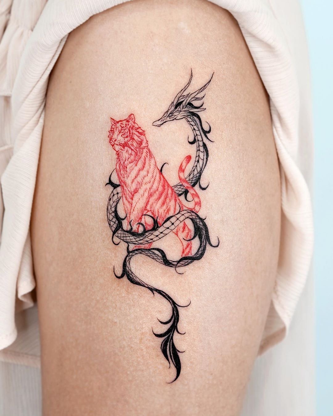 Изображения тигра, льва, волка, медведя и других тотемных животных означают связь с высшими силами, защиту богов и духов. Такие татуировки привлекают удачу и одновременно служат оберегом от неприятностей. Альтернативный вариант дизайна – знак зодиака. Согласно астрологическим практикам, символ знака зодиака оказывает сильное положительное влияние на жизнь человека. Союз звезд пророчит благополучие и процветание.