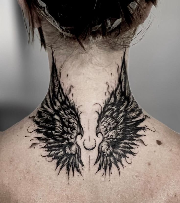 Причины выбора связаны с возможностью прикрыть нательный рисунок волосами в случаях, когда требуется сдержанный, классический образ. Другая причина повышенного спроса на такие тату — меньший уровень боли в сравнении с участками спереди или сбоку. Варианты дизайна — стрекоза и крест, луна и солнце, паук с паутиной, персонажи мультфильмов и фильмов.