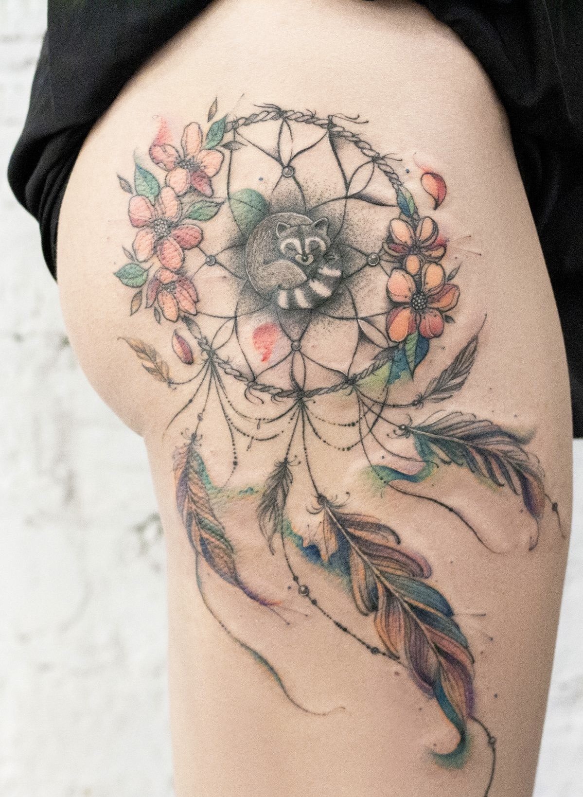 - Татуировка с мистическим ловцом снов олицетворяет безопасность и защищенность. Он напоминает форму луны с хрупкими и легкими перьями. Бедро позволяет свободно масштабировать эскиз, чтобы изобразить деликатные детали и мельчайшие элементы.