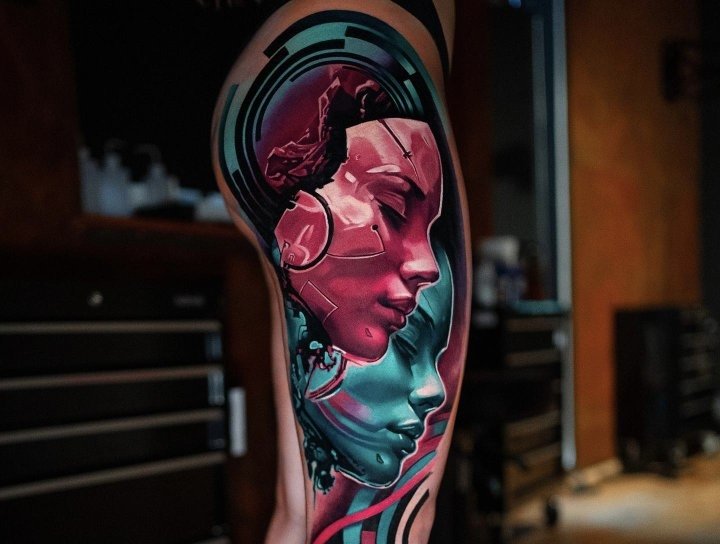 Татуировки в стиле киберпанк отражают эстетику популярного научно-фантастического жанра.