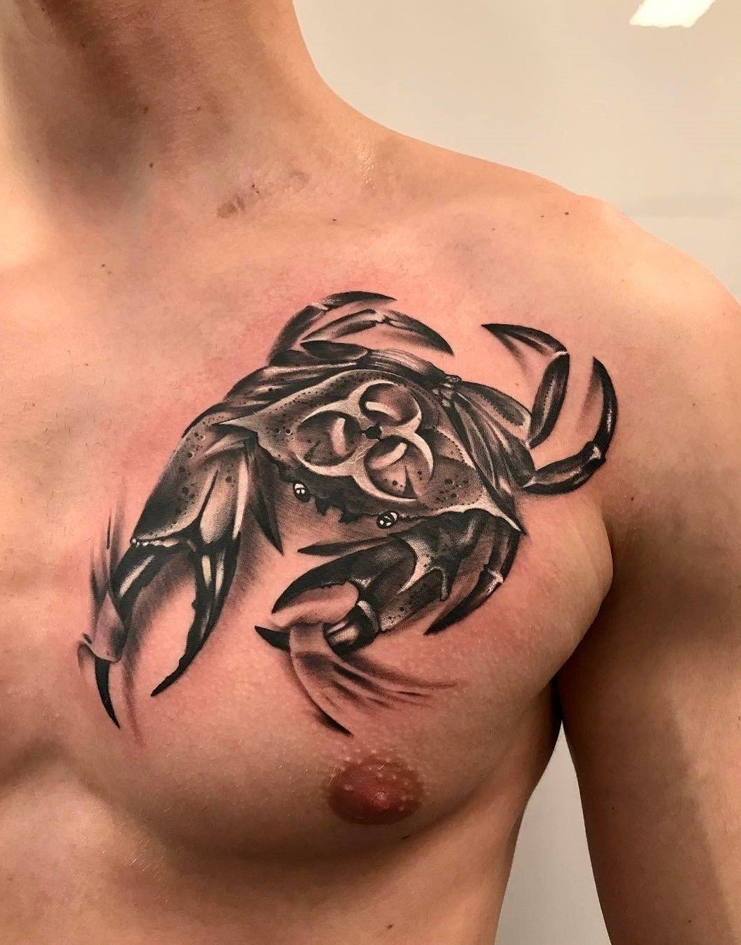 - Грудь: Эта часть тела - альтернативный вариант для тех, кто все же предпочитает масштабные тату, которые сочетают в себе различные элементы, цвета или стили. Особенно тату знак зодиака Рак на груди популярно среди мужчин, которые стремятся подчеркнуть свою силу, мужественность и брутальность.