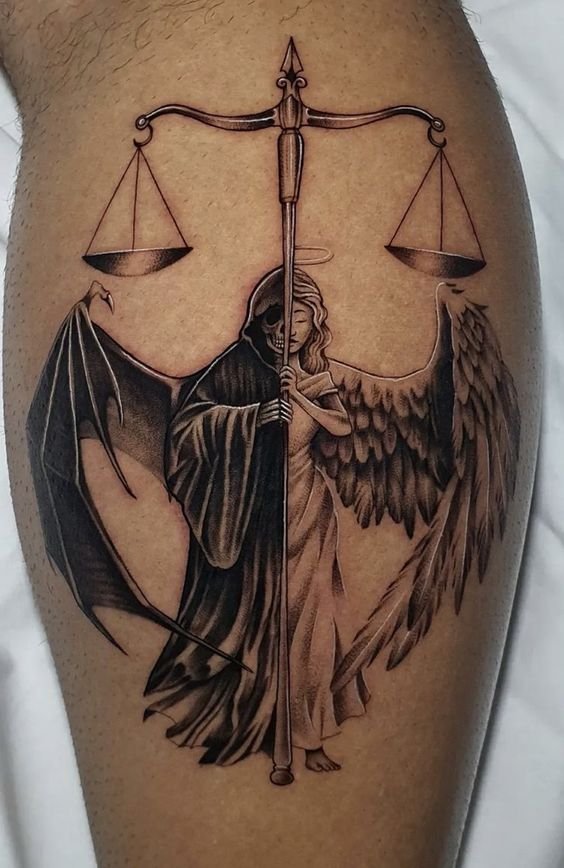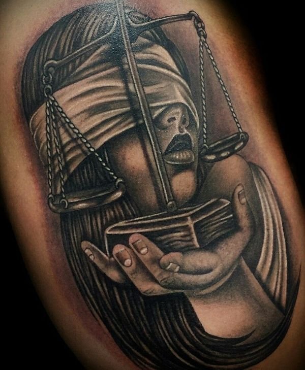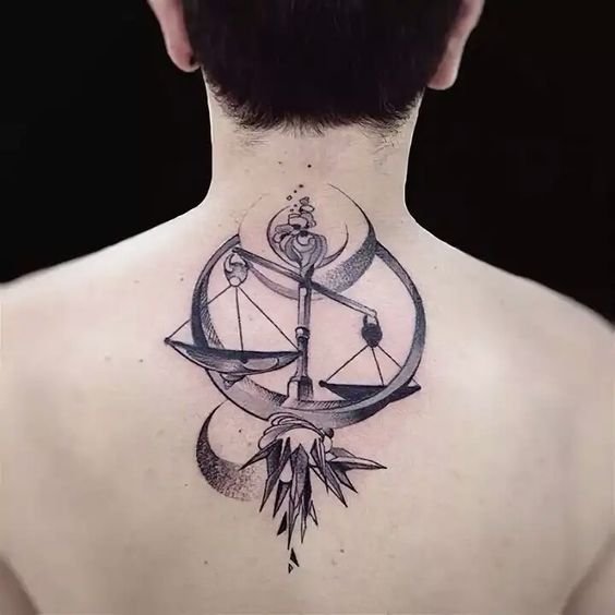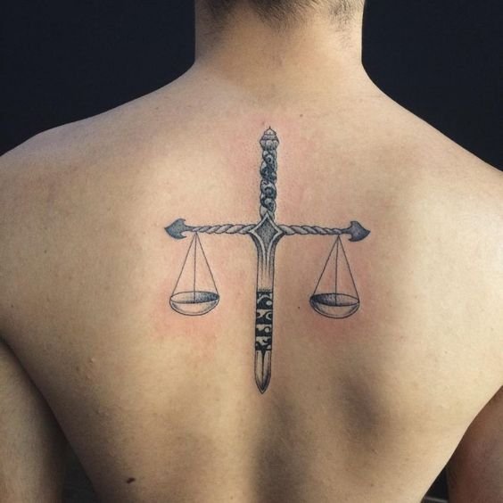 Мужчины обычно выбирают массивные татуировки Весов темных цветов. В качестве дополнительных элементов они могут использовать змей, мечи, богиню правосудия Фемиду и тому подобное.