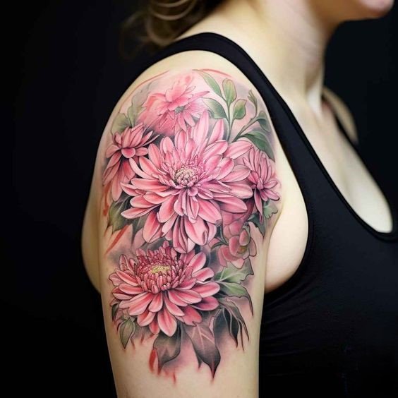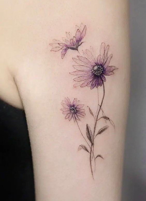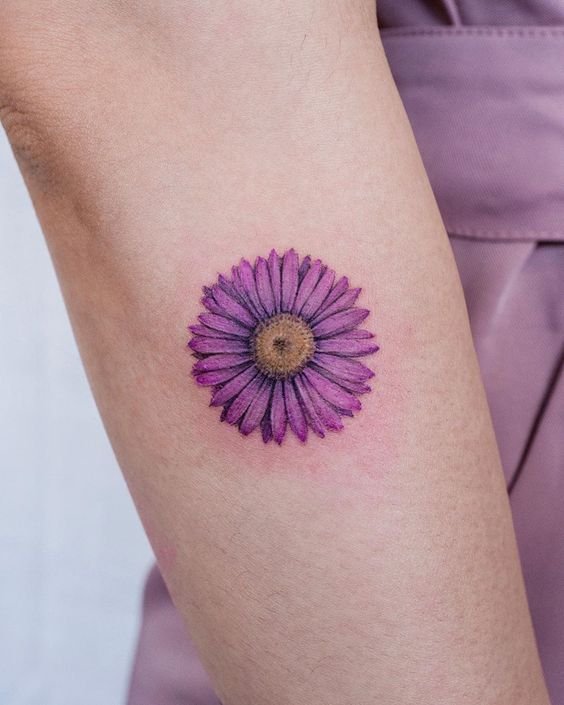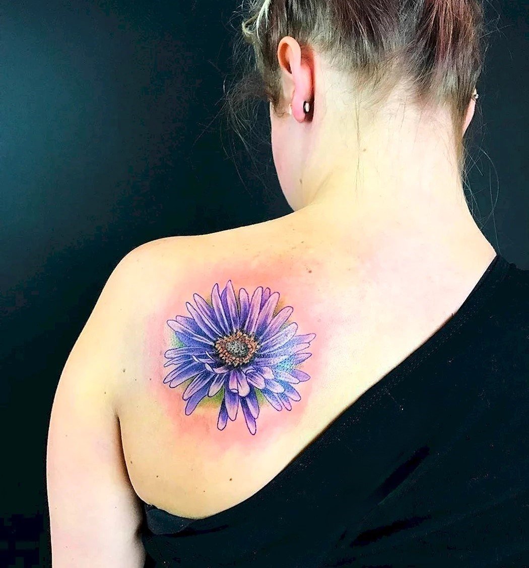 - Цветное изображение. Насыщенные оттенки фиолетового, синего или розового создают реалистичное и яркое изображение цветка, которое привлекает внимание. Цветные татуировки с астрой выглядят эффектно и стильно.