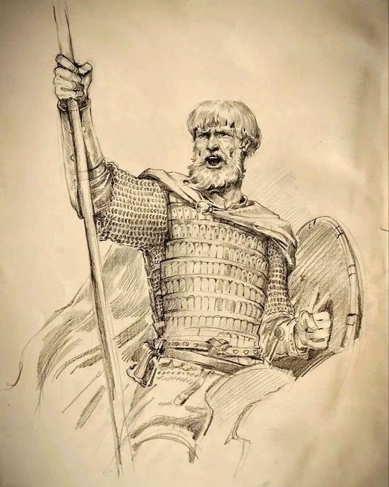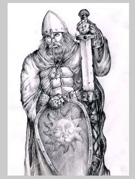 Эскиз богатыря несет в себе силу, стойкость духа и мужество.