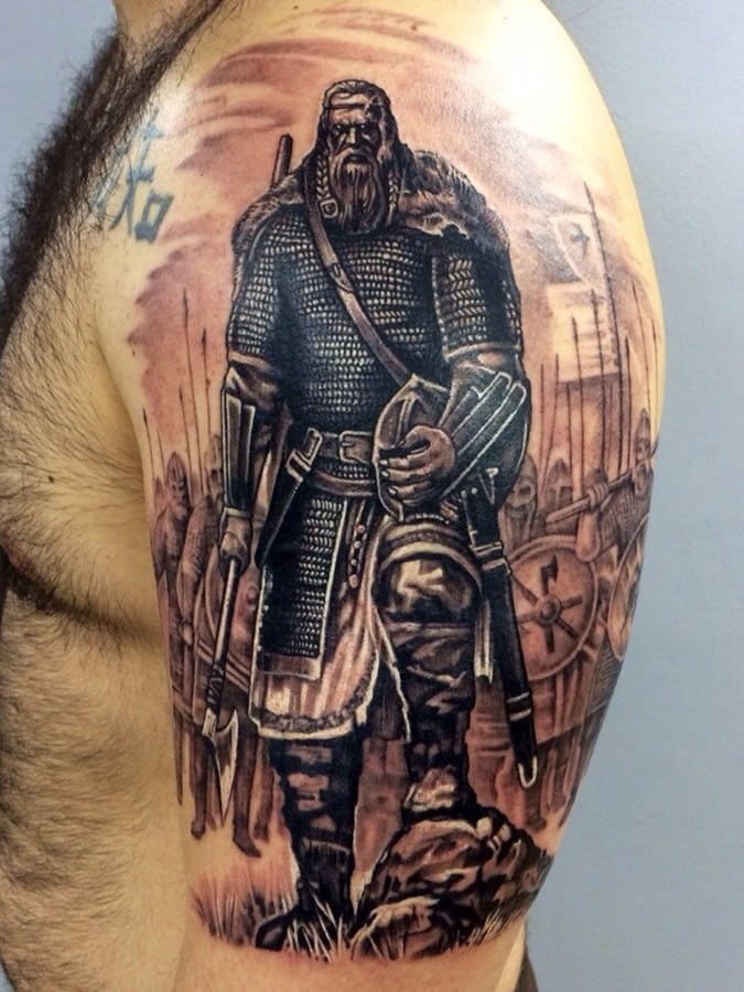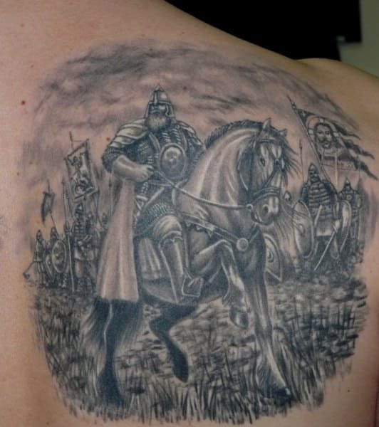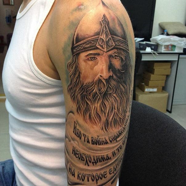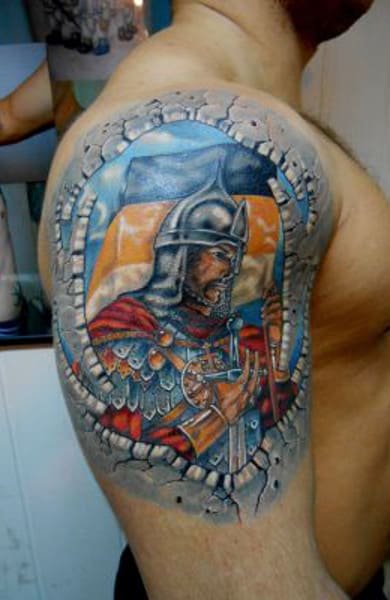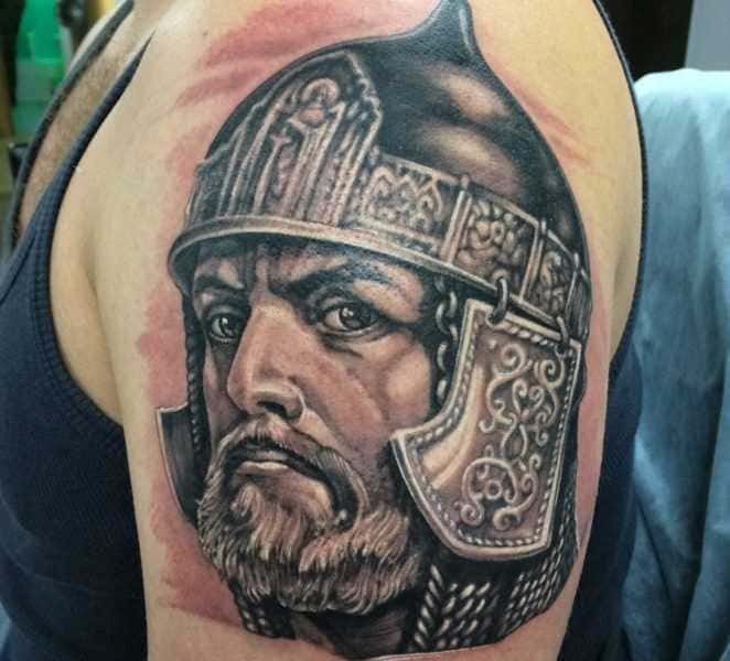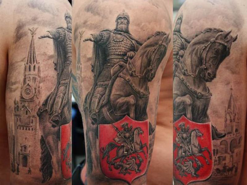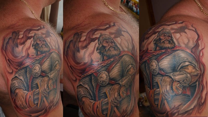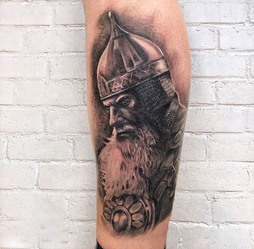 В искусстве тату широким спросом пользуются изображения сказочной тематики: герои сказок, мифов, былин и легенд. Одним из популярных героев, образ которого часто выбирают для татуировки, является богатырь. Образ богатыря нам всем давно знаком, это крепкий, статный мужчина, как правило, с широкими плечами и могучей бородой, в славных доспехах, с величественным взглядом. Богатыри защищали народ от различных злодеев, которые стремились напасть, и даже защищали свой народ от злых сил. Имена великих богатырей вошли в историю, про них снято множество фильмов и мультфильмов. Это положительные герои, защитники и храбрые воины, не удивительно что их изображения пришли и в индустрию нательной живописи.