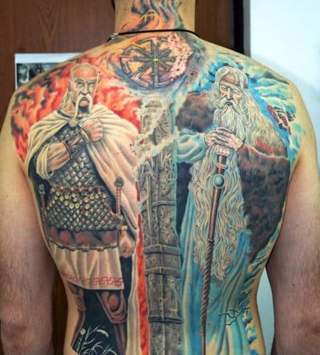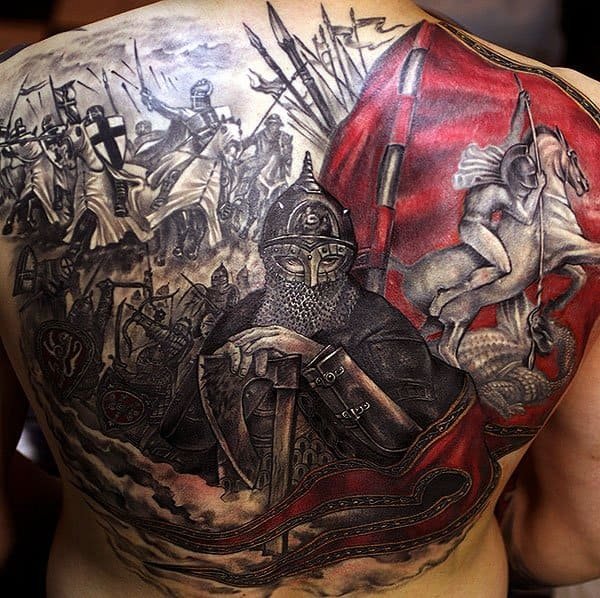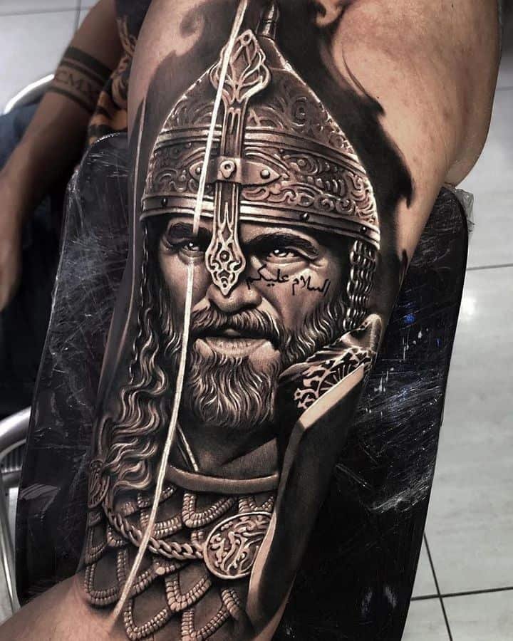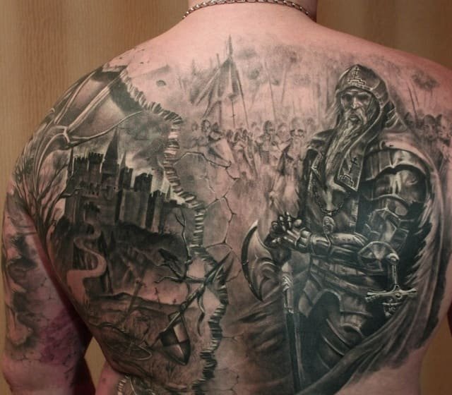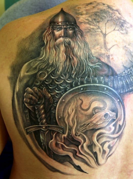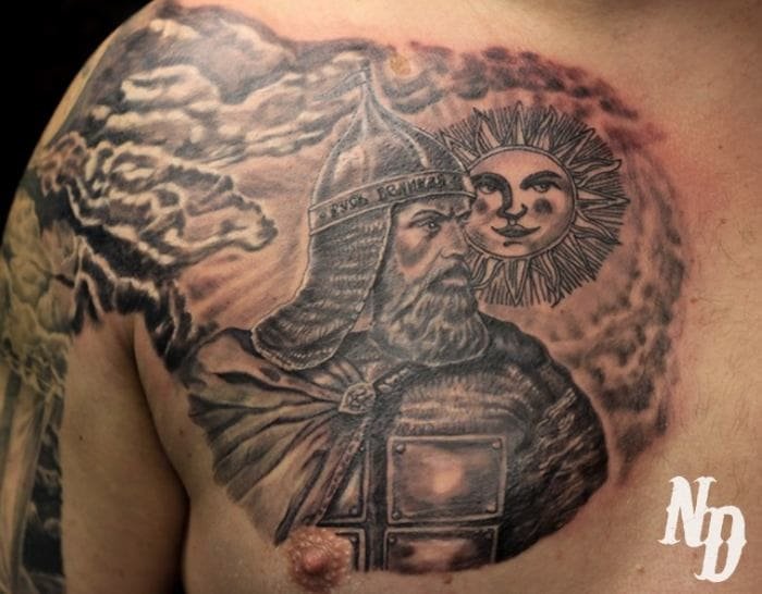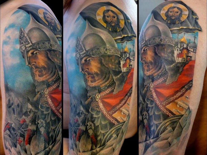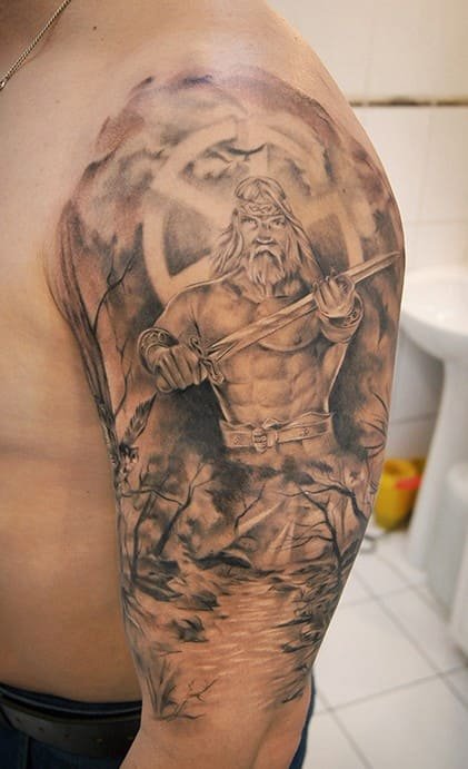 В искусстве тату широким спросом пользуются изображения сказочной тематики: герои сказок, мифов, былин и легенд. Одним из популярных героев, образ которого часто выбирают для татуировки, является богатырь. Образ богатыря нам всем давно знаком, это крепкий, статный мужчина, как правило, с широкими плечами и могучей бородой, в славных доспехах, с величественным взглядом. Богатыри защищали народ от различных злодеев, которые стремились напасть, и даже защищали свой народ от злых сил. Имена великих богатырей вошли в историю, про них снято множество фильмов и мультфильмов. Это положительные герои, защитники и храбрые воины, не удивительно что их изображения пришли и в индустрию нательной живописи.