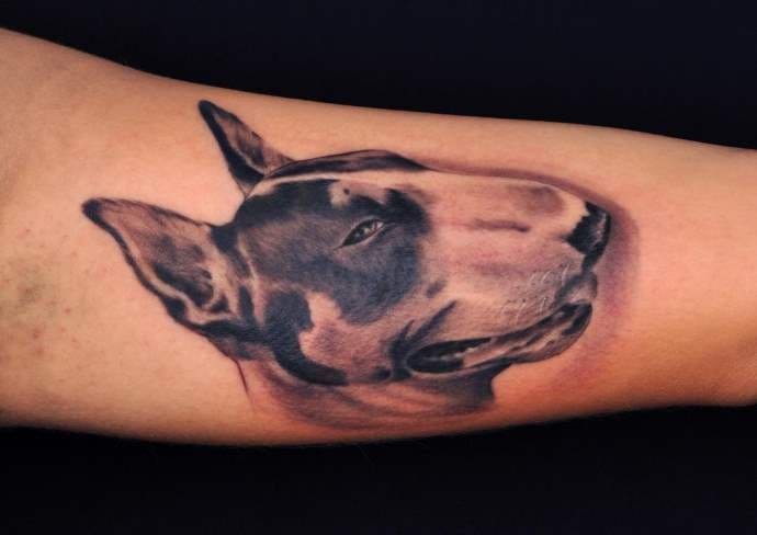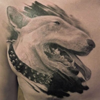 Тату бультерьер выполняется как в цветном, так и в черно-белом формате.