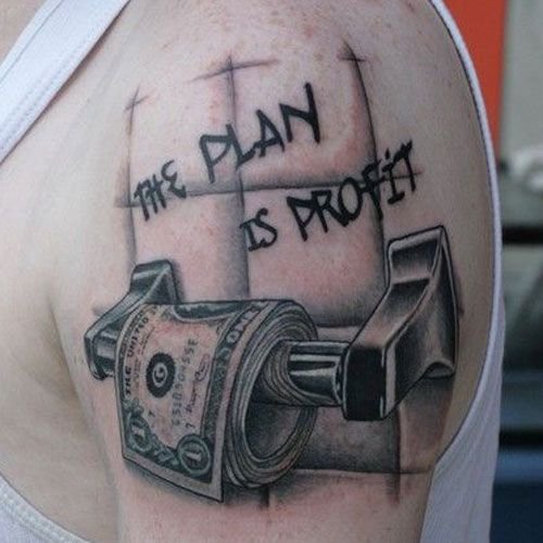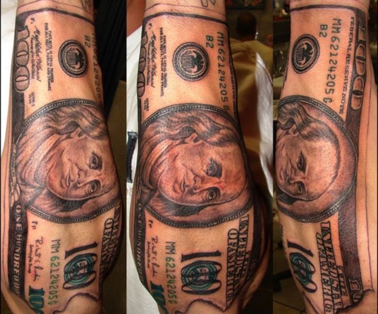 Деньги - универсальная татуировка, одинаково широким спросом пользуется у мужчин и у слабой половины. Места для нанесения изображения выбирают самые разные, по желанию. Это может быть тату на плече, спине, запястье, на кулаке и так далее.