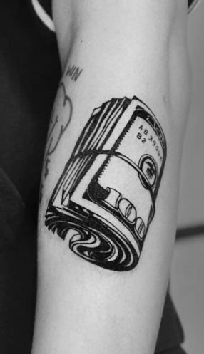 - Эскизы денег, а именно бумажных купюр, говорят о хорошем финансовом положении человека. Так же, такое изображение говорит о том, что человек любит деньги и старается накопить их как можно больше. Тату денег часто выступает стимулом для обладателя нательного изображения, помогает человеку быть уверенным в себе и идти к поставленной цели.