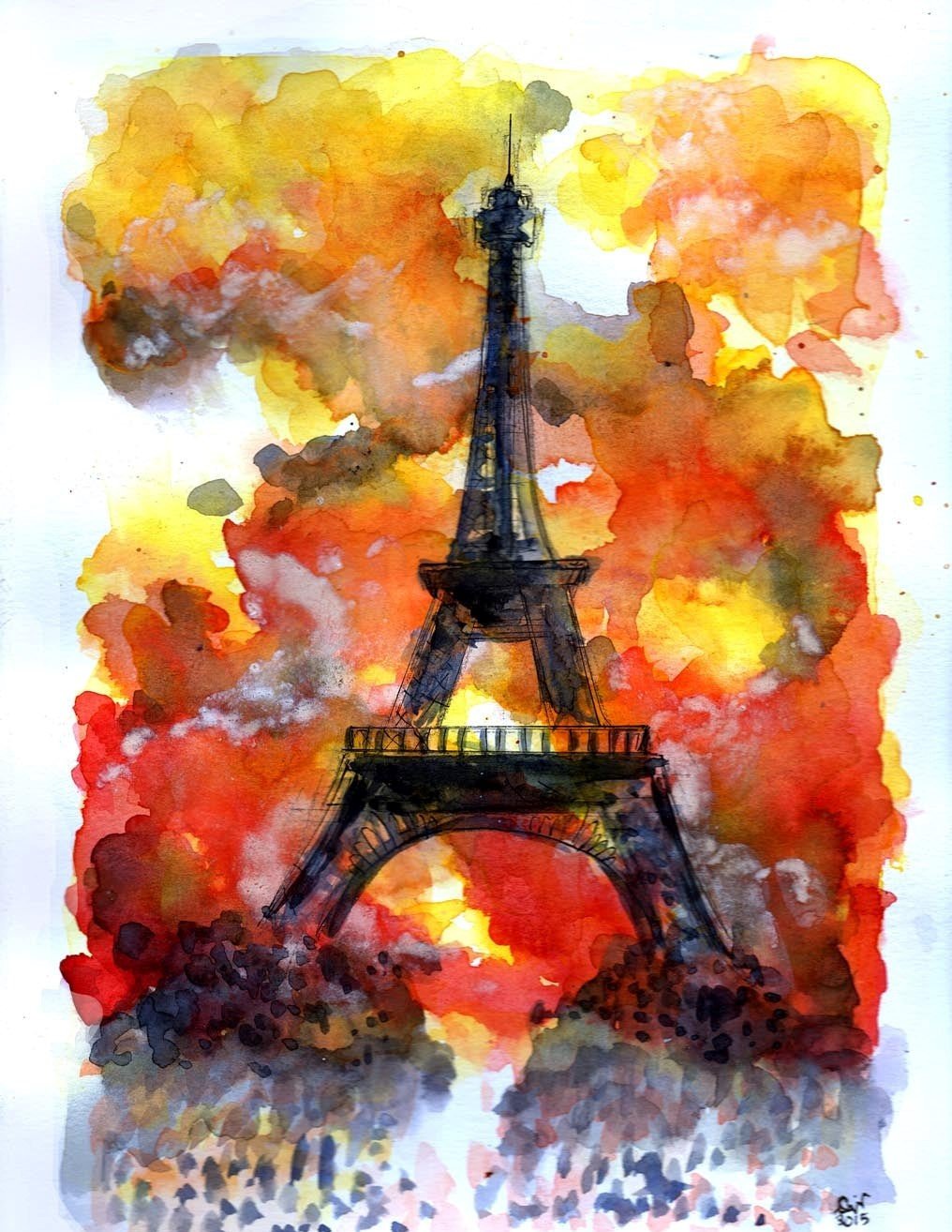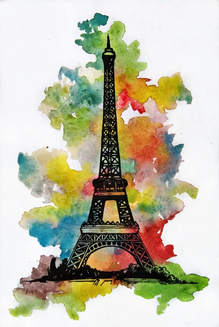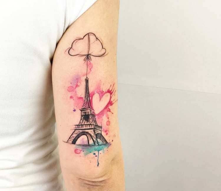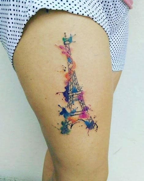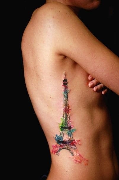 - Для романтичных натур отличным стилем для татуировки эйфелевой башни является акварель. Тату в акварельном стиле смотрится будто рисунок изобразили при помощи акварельных красок, частым дополнением служат множество разноцветных брызг и потеков, которые придает изображения воздушности.