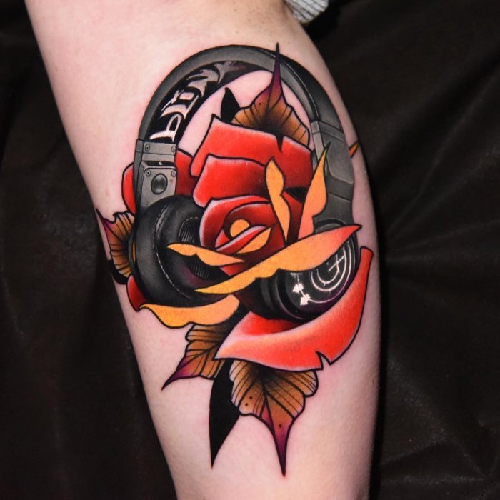 Сама картинка с наушниками, если тату будет выполняться в ретро-стиле, может быть дополнена кассетным или дисковым плеером, чтобы передать атмосферу того времени. Можно изобразить магнитофон, обложки альбомов любимых групп, а также добавить другие элементы для антуража: