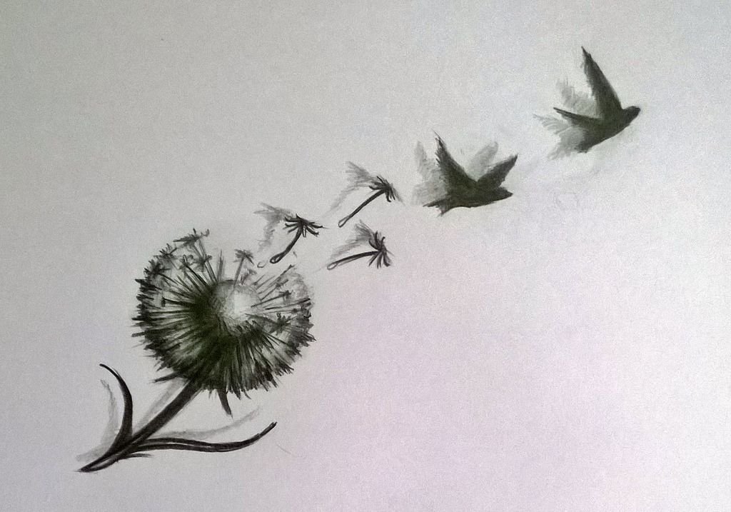 - Самым популярным изображением является рисунок одуванчика, от которого вместо семян разлетаются птицы. Так как в изображении присутствуют птицы, данное изображение трактуется как любовь к свободе и независимости. Такая татуировка очень красиво будет выглядеть на местах с большой площадью, на которых изображение передаст всю свою суть и красоту. Это может быть спина, лопатки, предплечье.