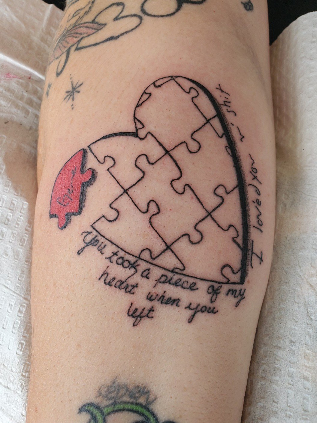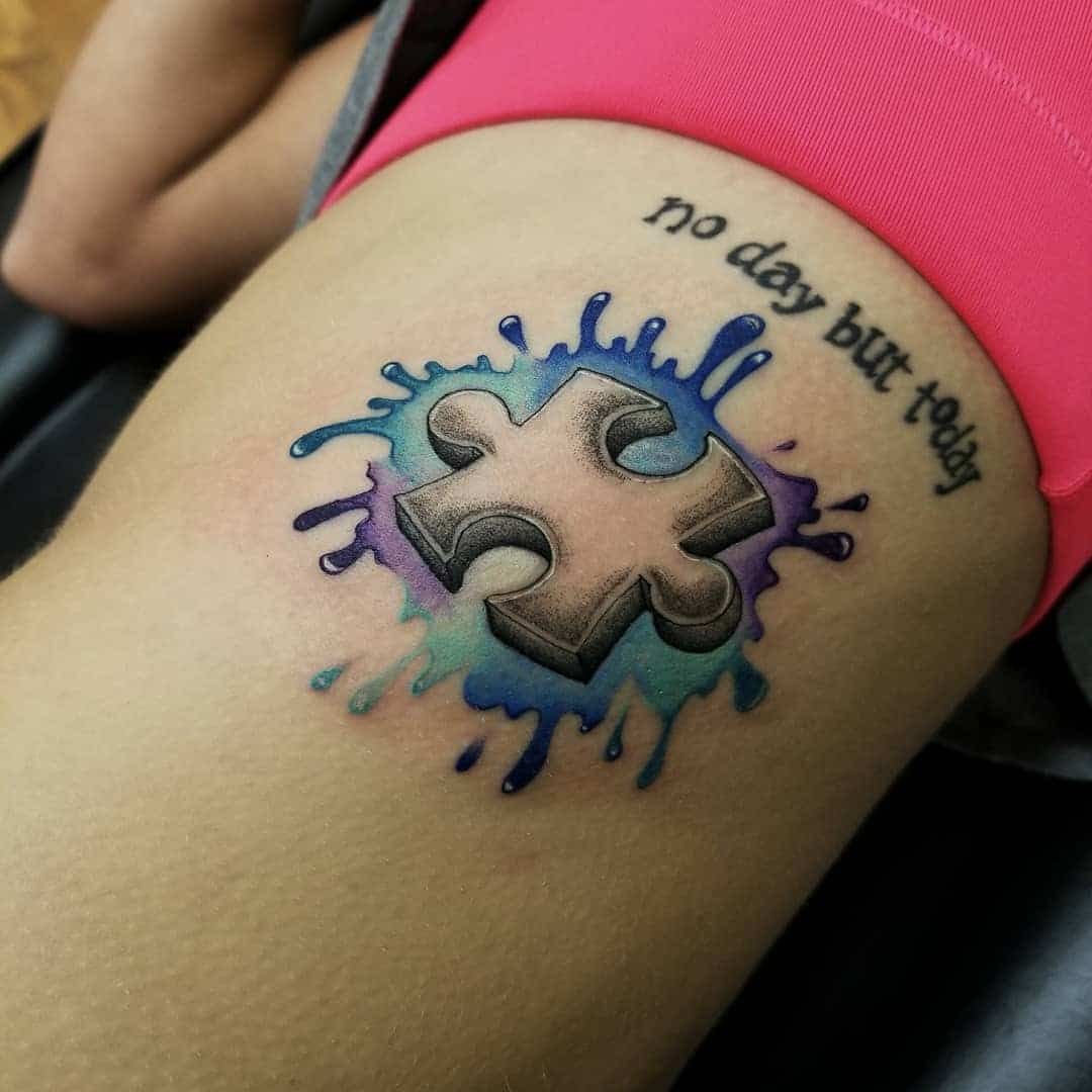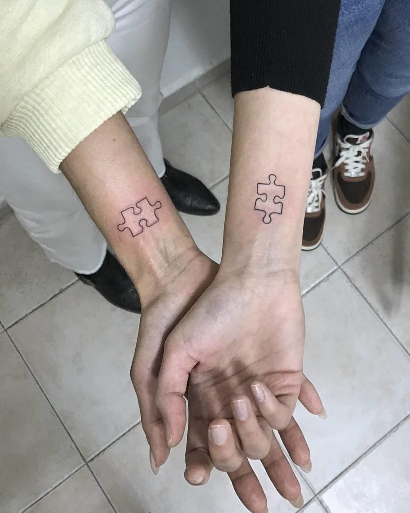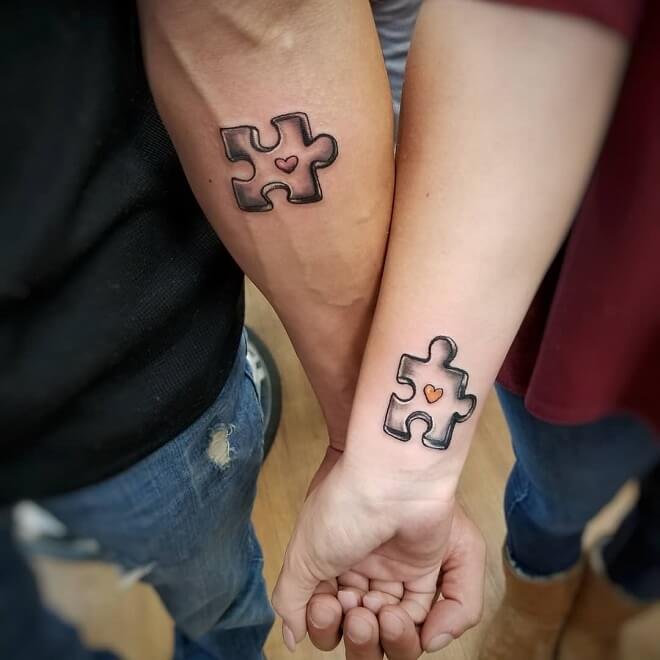 Так же, пазл довольно часто выступает в роли парной татуировки. Таким образом пара демонстрирует что две половинки нашли друг друга, и удачно скрепились. Так девушка и парень говорят всему миру что они не могут друг без друга, ведь тогда пазл будет незавершенным.