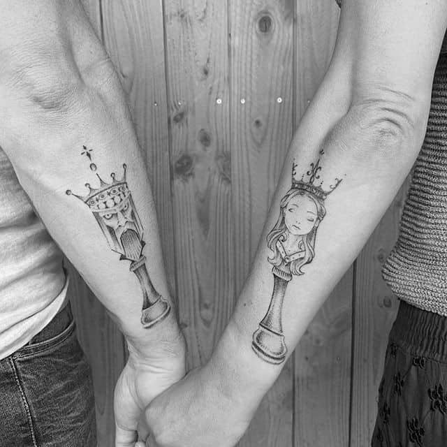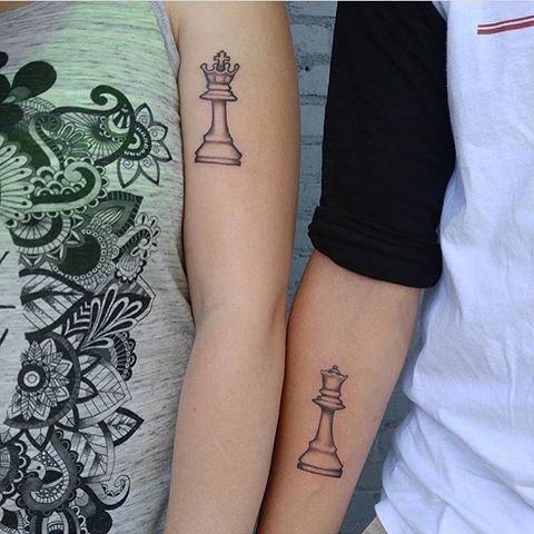 Довольно часто можно встретить и парные рисунки. Хорошим вариантом для дополнения тату эскиза шахмат являются памятные для Вас даты. При выборе цвете для данного нательного изображения, в основном выбор останавливается на черно-белом варианте. Но также довольно интересно и насыщенно эскиз выглядит и в цветной вариации рисунка.