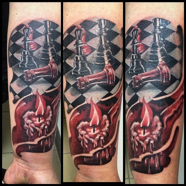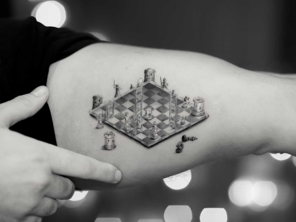 Поэтому сфера тату индустрии непрерывно растет и пользуется большим спросом уже много лет. В наше время существует большое количество эскизов для татуировок, а также стилей и цветовых решений тату. Большим спросом пользуется татуировка с шахматами как для парней, так и для девушек. Шахматы — это настольная игра, которая популярная уже большое количество времени. Изображение на теле шахмат имеет свои обозначения.