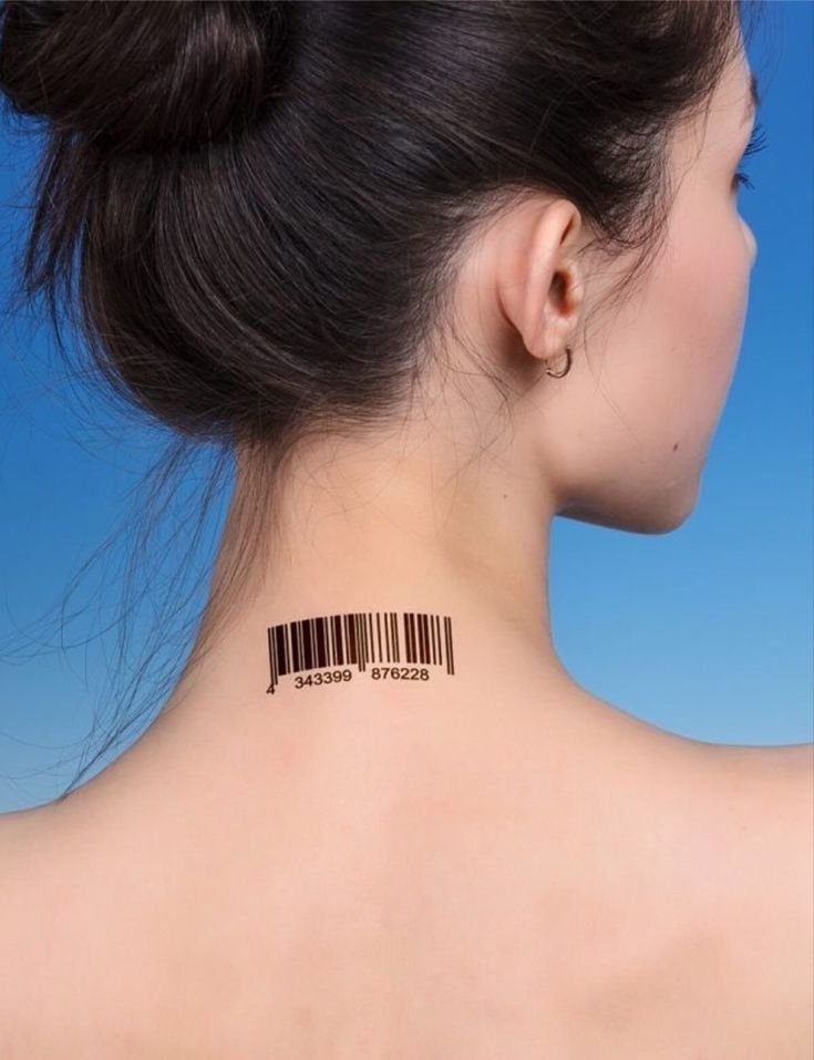 - Тату-эскиз "штрихкод" может говорить о том, что в скором времени наступит такое будущее, где в каждого человека будет внедряться чип, дабы было легко каждого отслеживать и порабощать.
