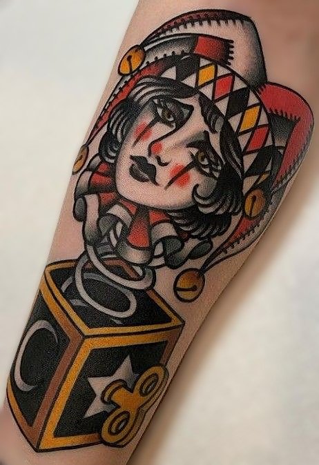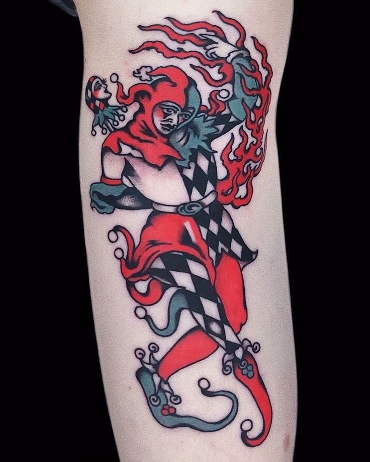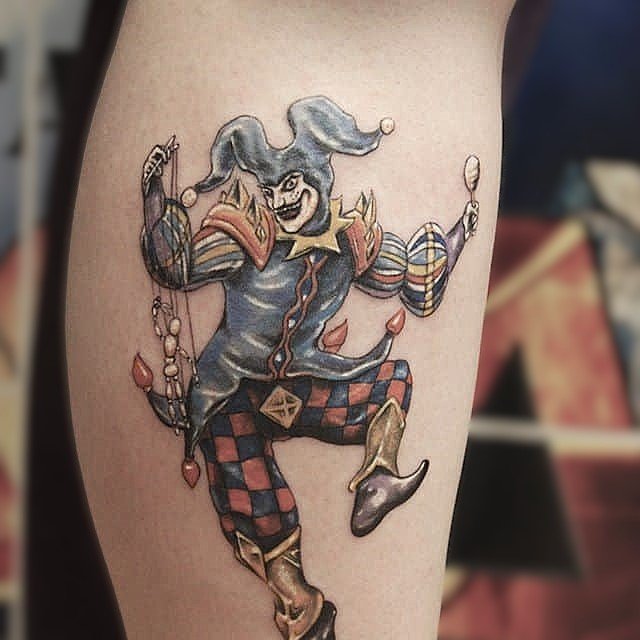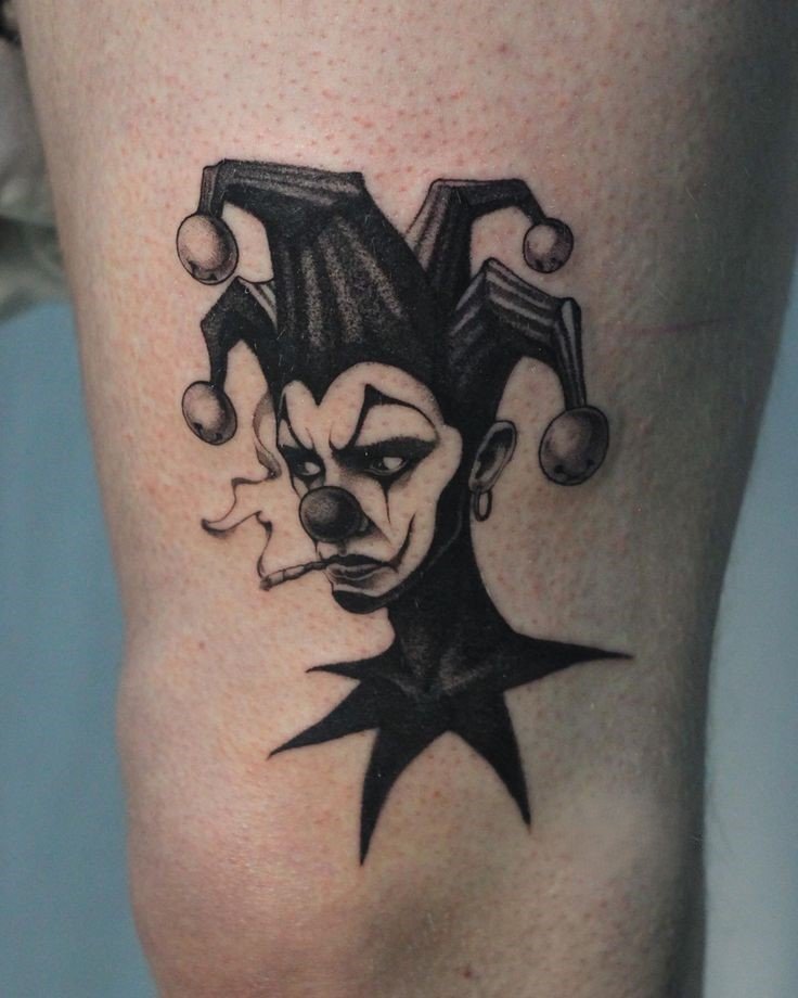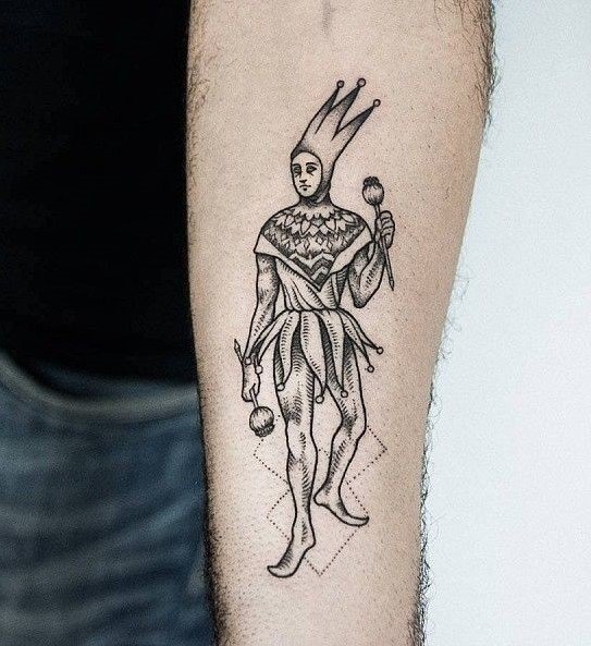 - Тату шута указывает на веселый нрав человека, с такими людьми достаточно легко общаться. Это душевные, компанейские личности, не бояться показаться смешными, любят веселить и удивлять окружающих людей.