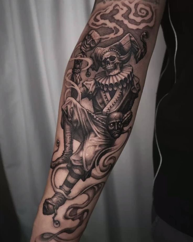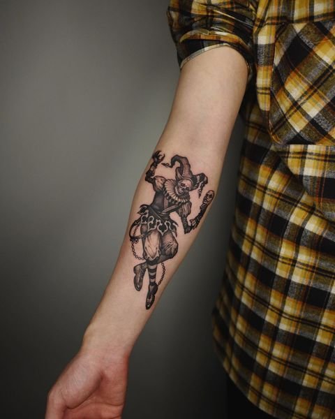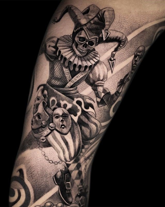 Шут одинаково эффектно будет смотреться в стиле реализм, акварель, трэш-полька, графика, биомеханика, олд-скул, нью-скул и так далее.