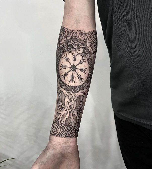 Татуировки с Вегвизиром могут выполняться в различных стилях, подчёркивающих его уникальную эстетику и глубокий смысл: