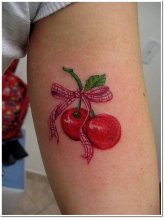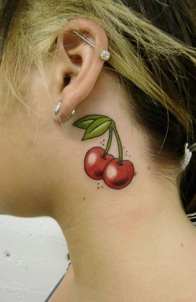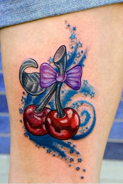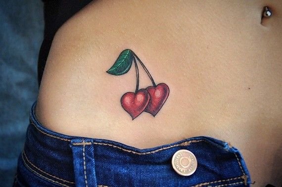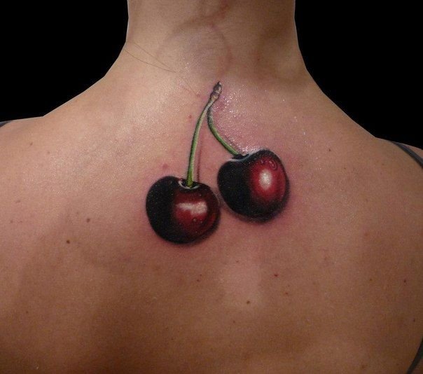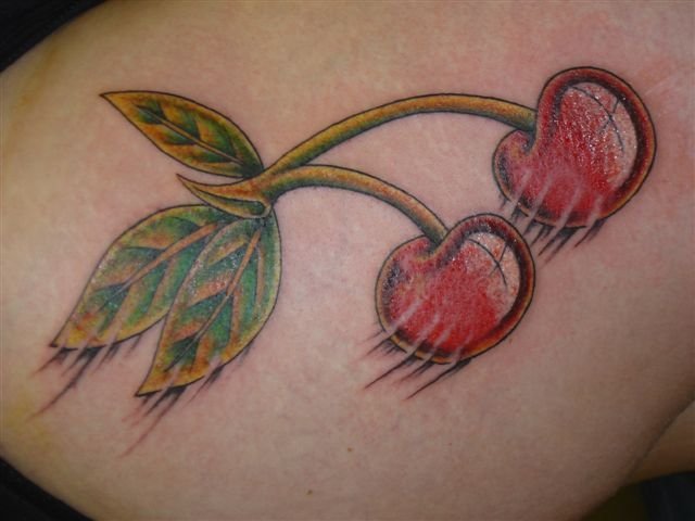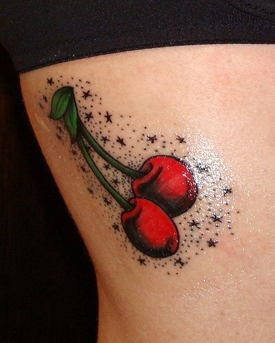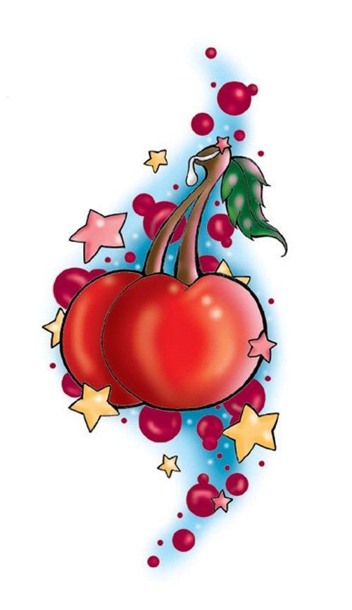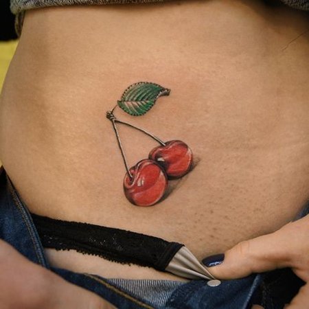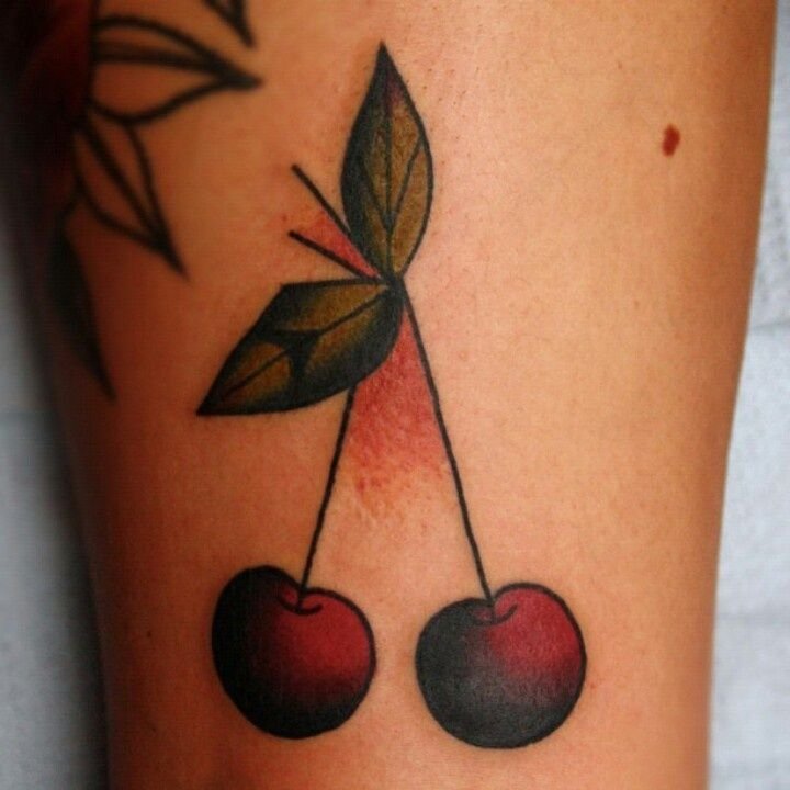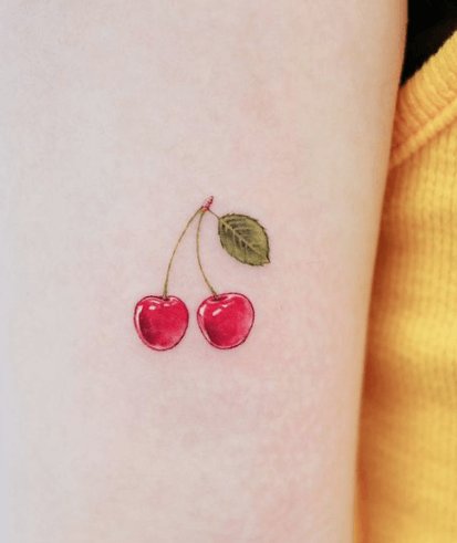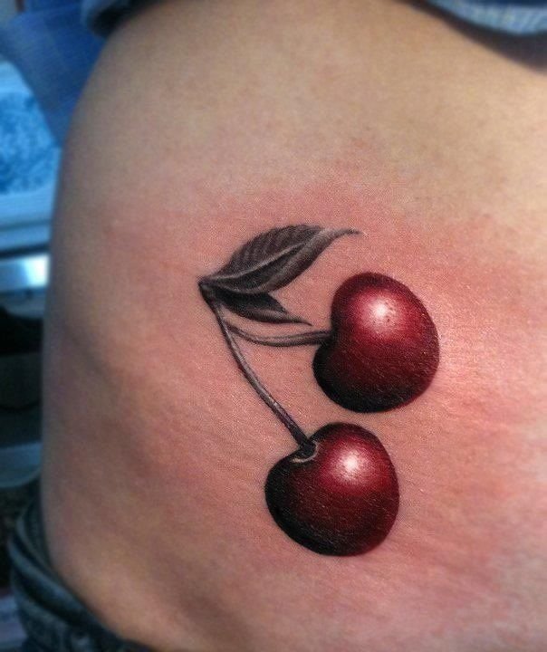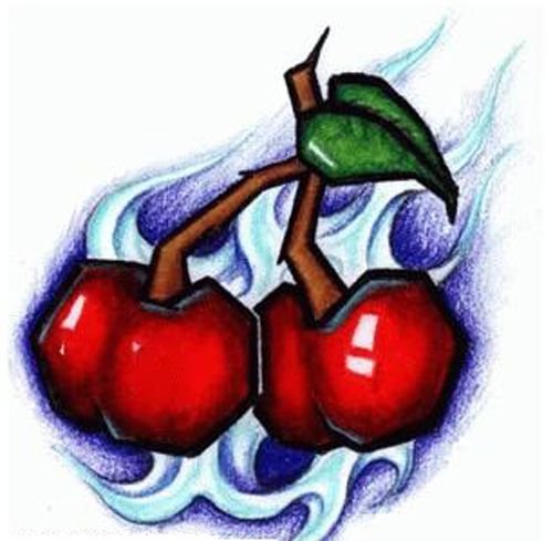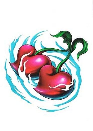 Второй вариант является символом воодушевляющей красоты, нежности, высокой любви, трепетных чувств, а вот ягодки вишни несут в себе нотки пикантности. Как правило, рисунок вишенок в татуировке привлекает своей простотой, но в то же время яркими, сочными цветами. Изображение вишенки принято считать женской татуировкой, она может быть набита на абсолютно любой части тела, в различных цветовых тонах. Это может быть как само изображение ягод, так и с дополнительными элементами, к примеру листья, бабочка, узоры и так далее. Татуировка может быть исполнена в любом предпочитаемом стиле, самые популярные это "Олд Скул" и "Нью Скул". Имея миниатюрные формы, данные изображения пользуются широким спросом, их можно наносить на любой участок тела, и довольно легко спрятать от посторонних взглядов.
