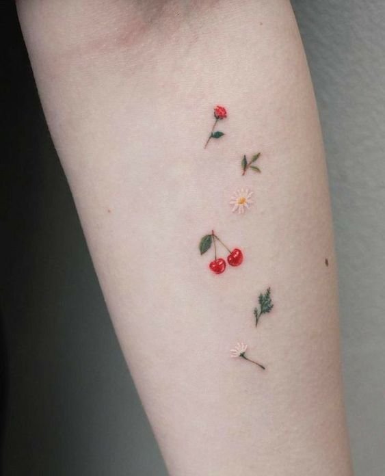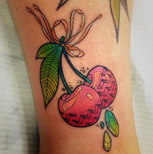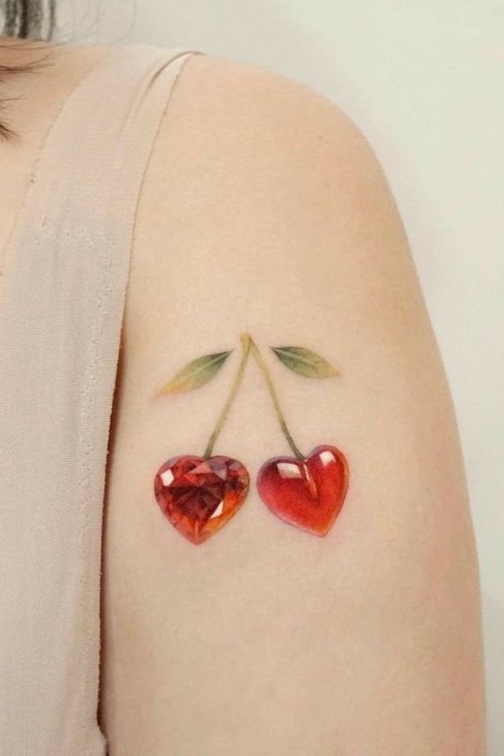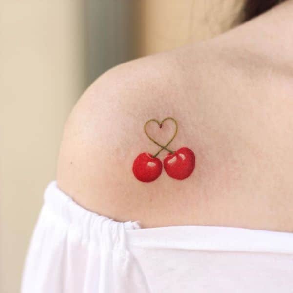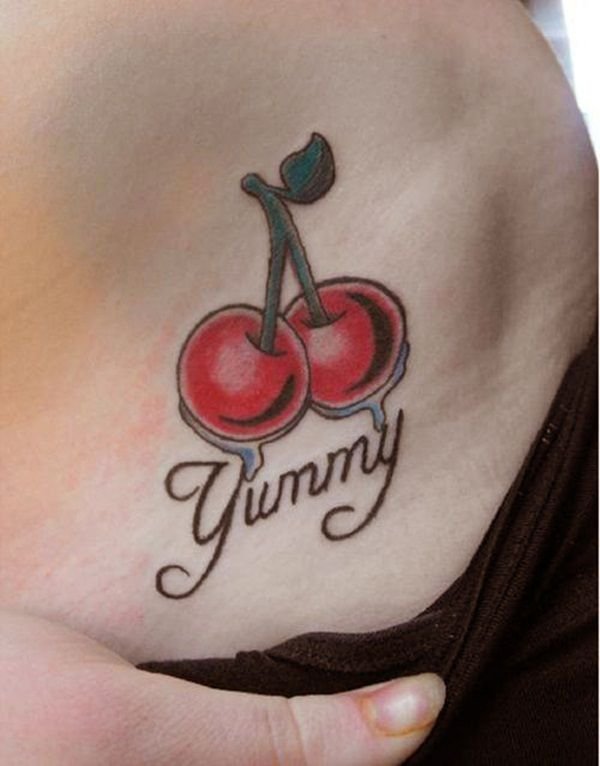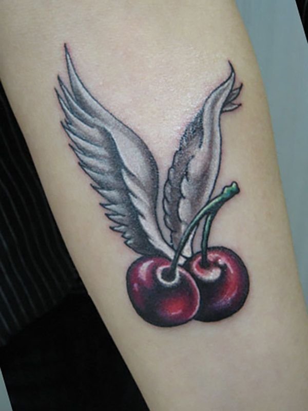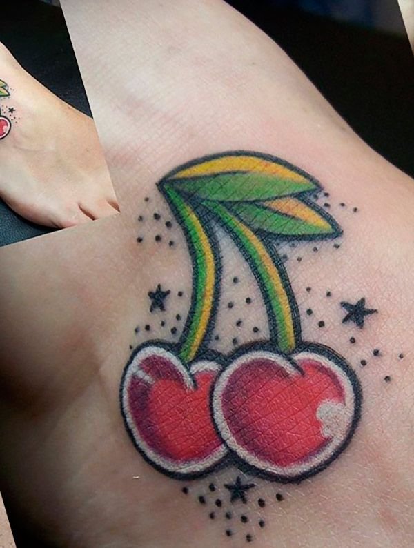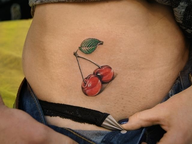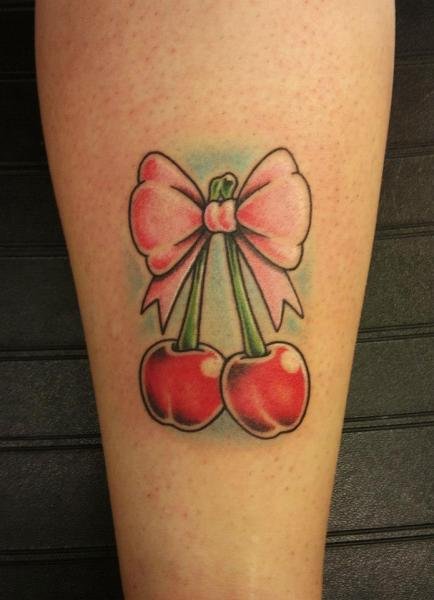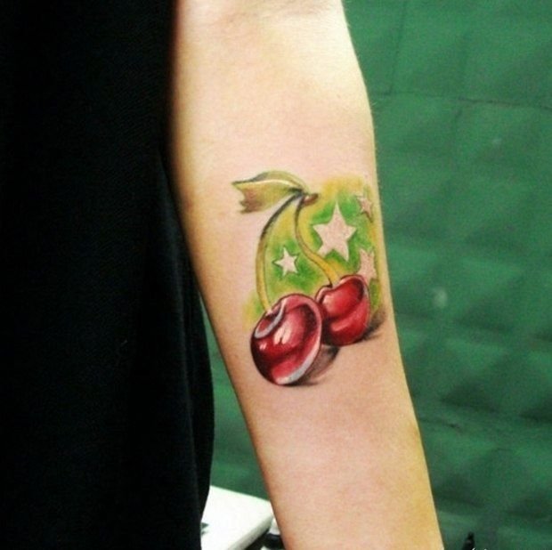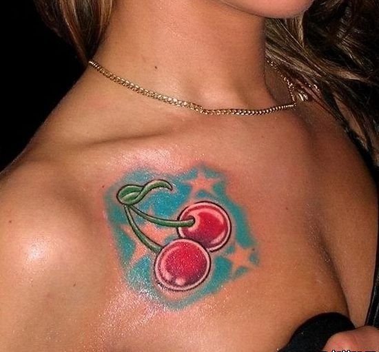 Второй вариант является символом воодушевляющей красоты, нежности, высокой любви, трепетных чувств, а вот ягодки вишни несут в себе нотки пикантности. Как правило, рисунок вишенок в татуировке привлекает своей простотой, но в то же время яркими, сочными цветами. Изображение вишенки принято считать женской татуировкой, она может быть набита на абсолютно любой части тела, в различных цветовых тонах. Это может быть как само изображение ягод, так и с дополнительными элементами, к примеру листья, бабочка, узоры и так далее. Татуировка может быть исполнена в любом предпочитаемом стиле, самые популярные это "Олд Скул" и "Нью Скул". Имея миниатюрные формы, данные изображения пользуются широким спросом, их можно наносить на любой участок тела, и довольно легко спрятать от посторонних взглядов.