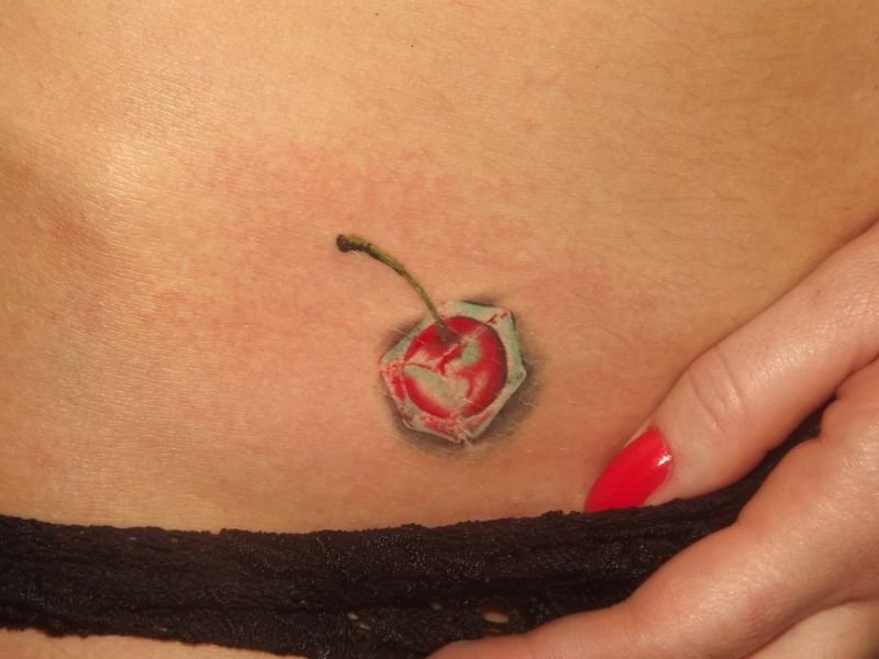 - Ягодка на торте. Часто встречаемое изображение это ягодка вишни на кусочке торта, целом торте либо это пирожное. Такая татуировка является неким талисманом, который притягивает сладкую жизнь.