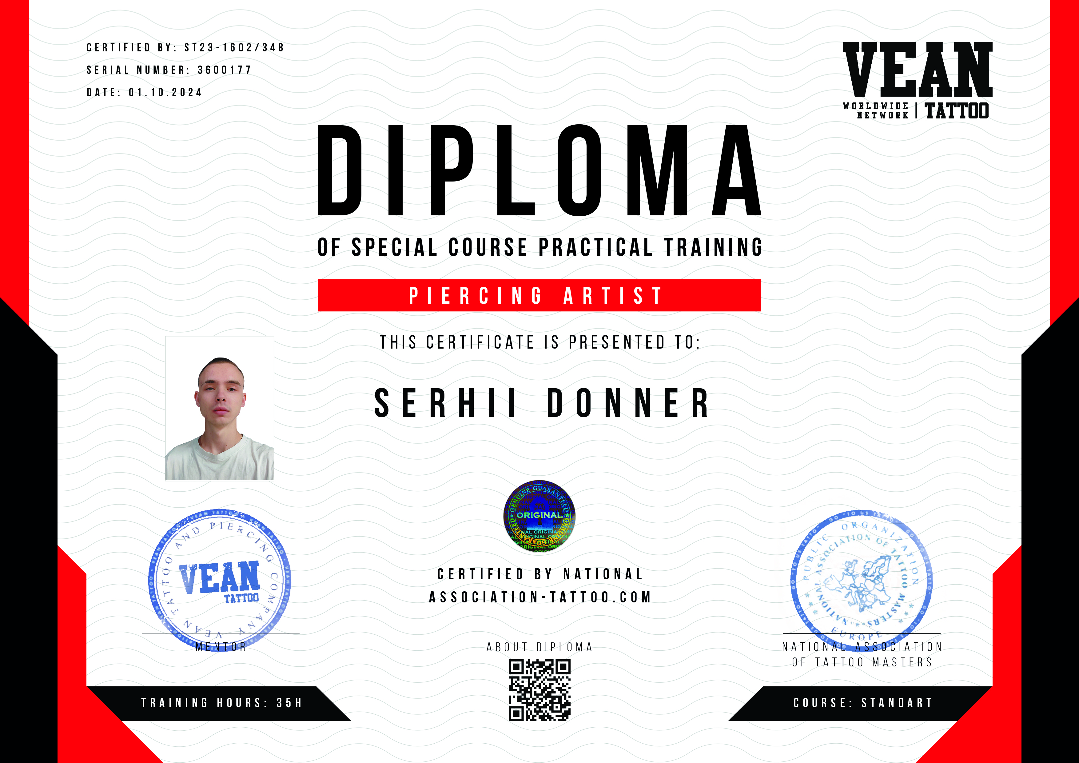 Меня зовут Сергей, и я профессиональный мастер пирсинга в студии VEAN TATTOO. Занимаюсь этим искусством с 26 сентября 2024 года, и с тех пор посвятил себя созданию качественного, безопасного и эстетически совершенного пирсинга.