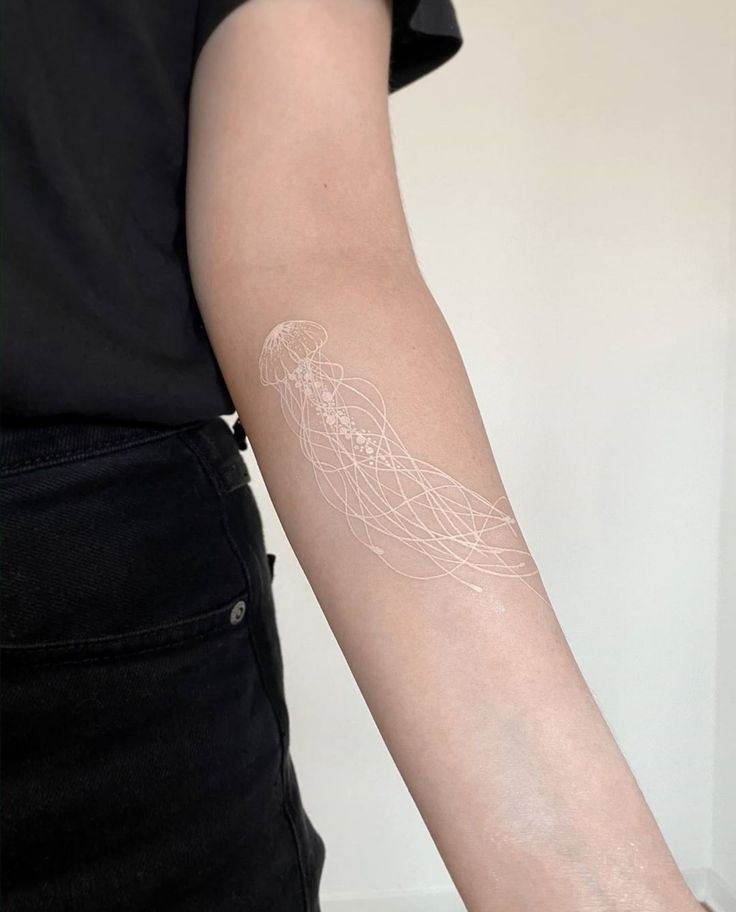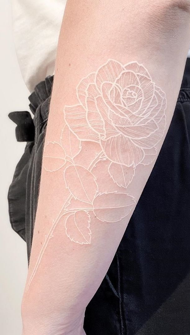 Оригінальні натільні малюнки, зроблені білим барвником, дуже популярні й у чоловіків, і у жінок. Технологія їх виконання схожа з технікою нанесення традиційного монотонного або кольорового тату, а виглядають вони особливо елегантно і навіть витончено. Детальніше про цей напрямок в тату індустрії розповімо в оглядовій статті.