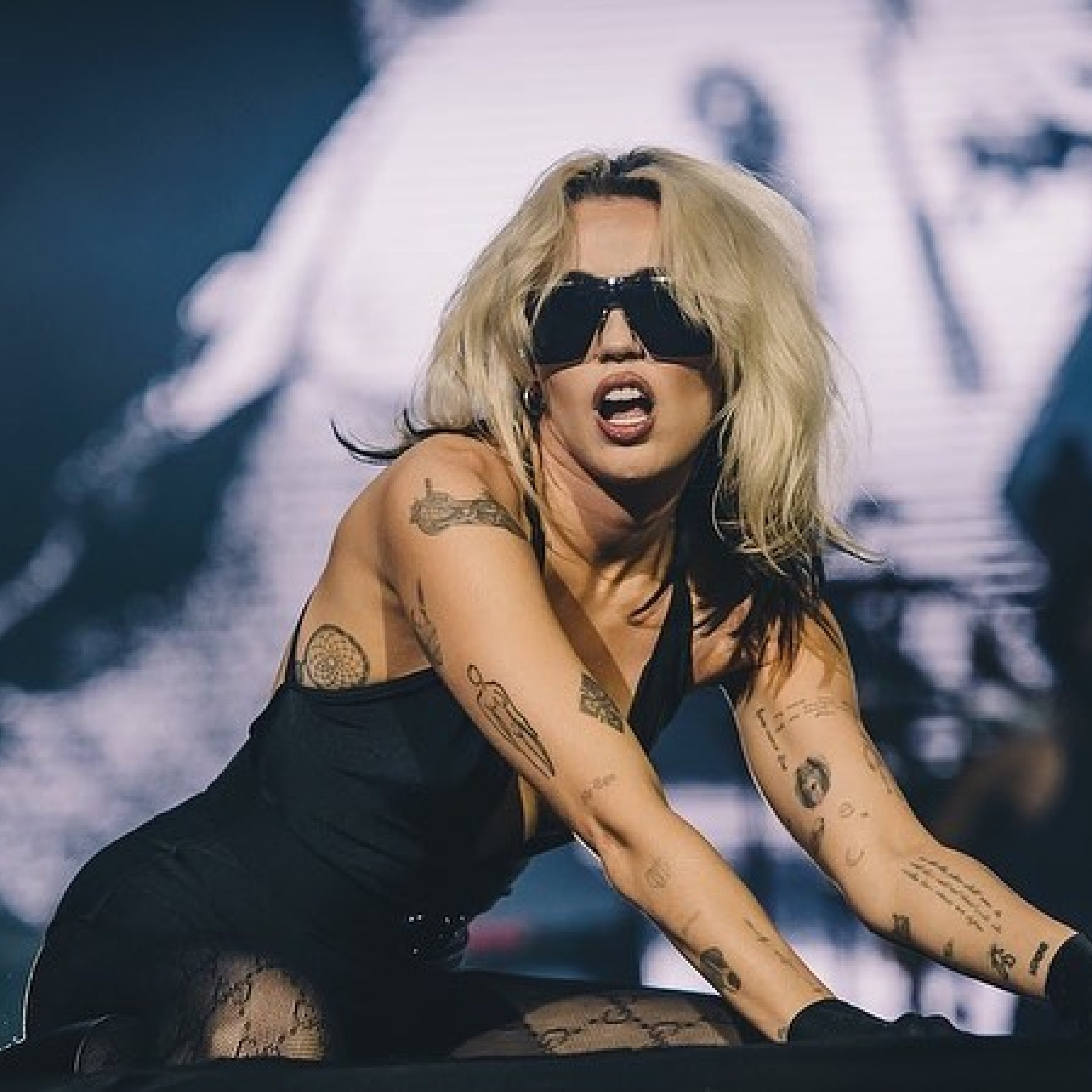 Майлі нерідко звертається до індуїстських релігійних символів. Так на її руці витатуйований сакральний знак Ом, який означає "слово сили". Це звук, який завершує будь-яку молитву, медитацію або релігійний спів і ототожнюється з божественною енергією.