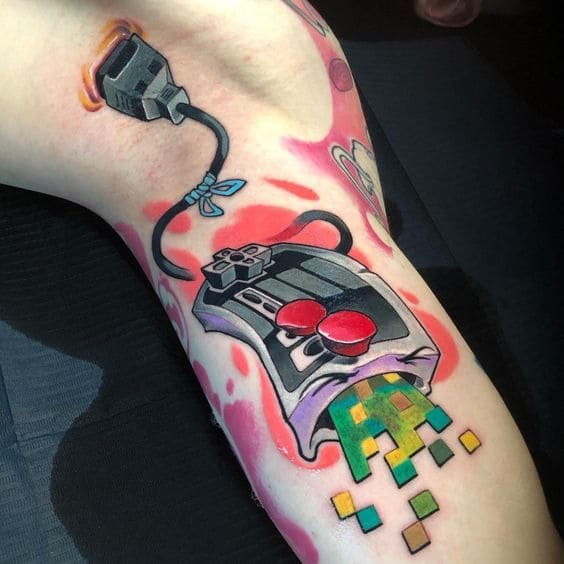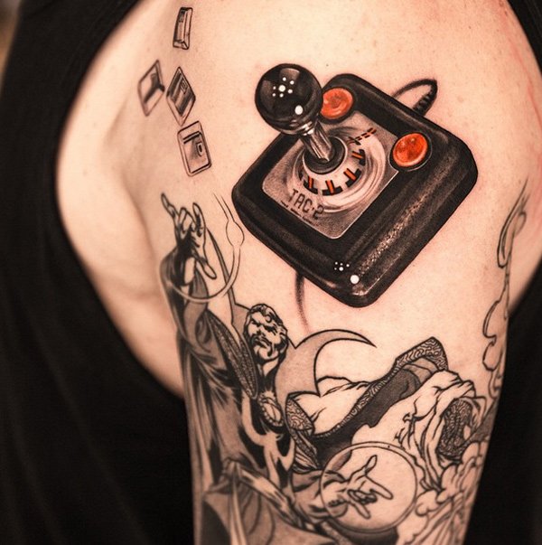 Як може виглядати робота на тілі, де для татуювання використаний ескіз джойстик? Це може бути один або два маніпулятори, розташованих поруч, а фоном може бути сама приставка. Тату може бути доповнено й зображенням старого телевізора, на якому запущена гра.