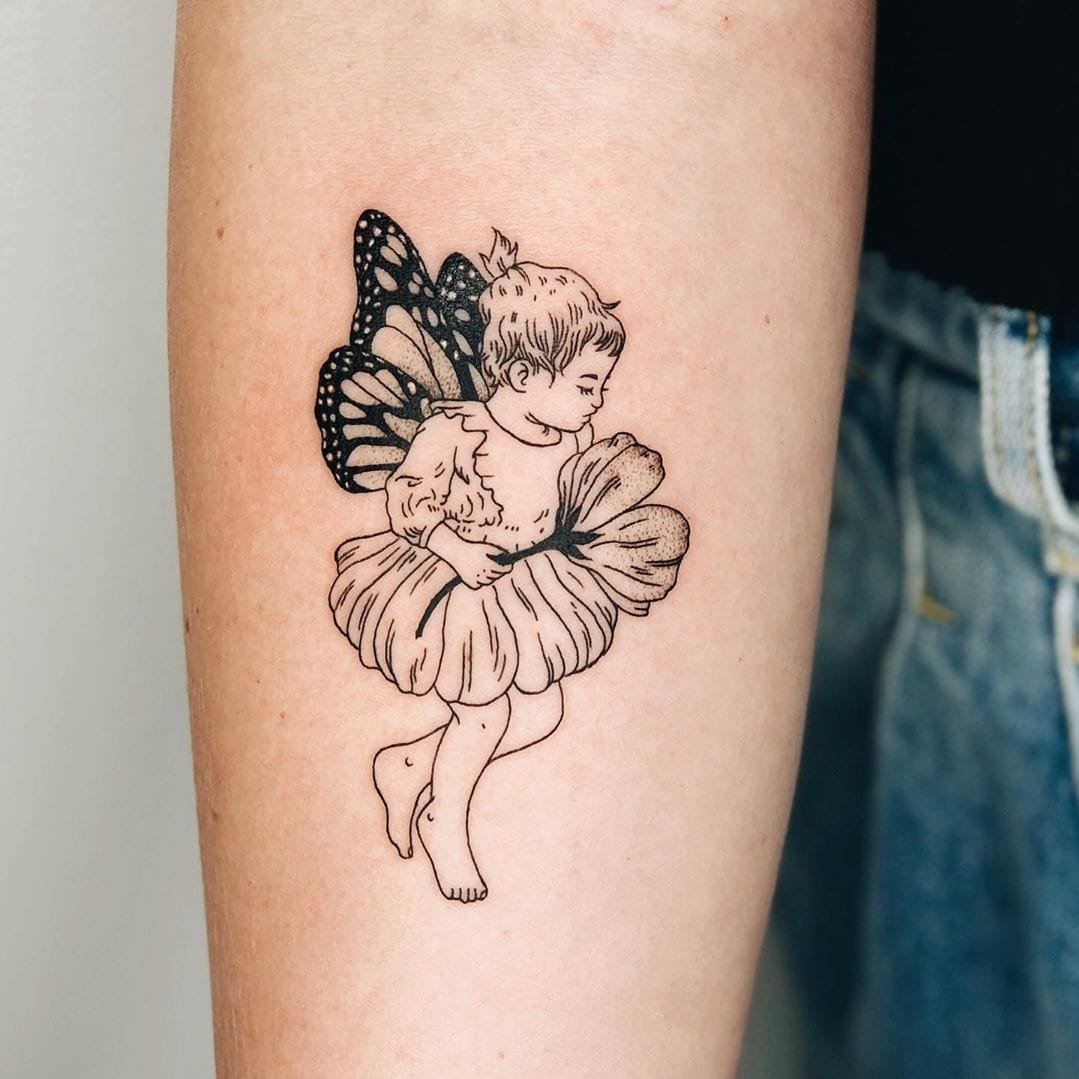 Дане татуювання виглядає дуже жіночно і романтично. Тату часто доповнюють різними елементами, які гармонійно доповнюють картину. Це можуть бути рослини, метелики або ж, наприклад розсип зірок. Також, досить часто тату майстра зображують фею з чарівною паличкою або ж просто сидить на красивій квітці. Часто до цього тату ескізу додають цікавий елемент у вигляді смугастих шкарпеток на ногах, це також приносить трохи грайливості та легкості даному зображенню.