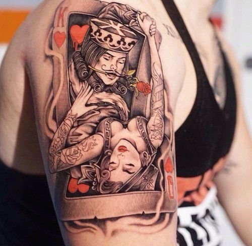 Тату з гральними картами часто виступають як парне татуювання для закоханих. В даному випадку у хлопця на тілі присутнє тату з картою короля, а у його другої половини - тату з дамою. Як правило, масть карт в даному варіанті - черва.
