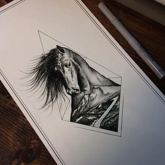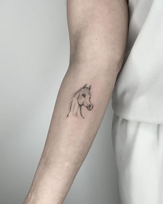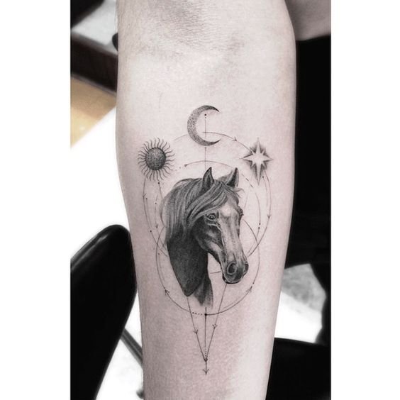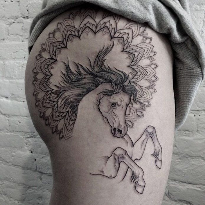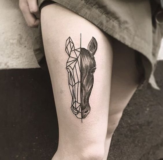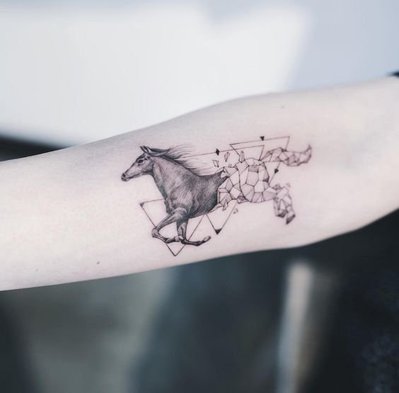- Кінь виконаний в схематичному зображенні це рідкість, дане татуювання показує, що її володар вельми оригінальна та цікава особистість.