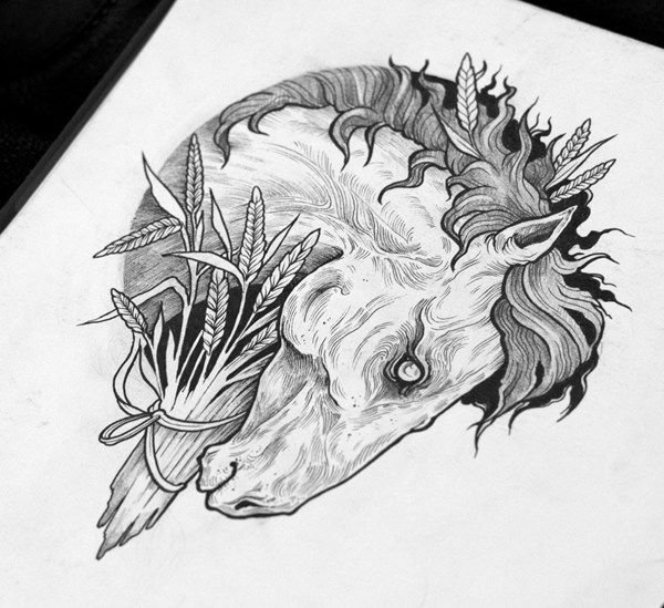 - Трохи моторошно виглядає тату з черепом коня, але несе воно у собі лише позитивні якості, таке зображення служить оберегом для свого володаря.