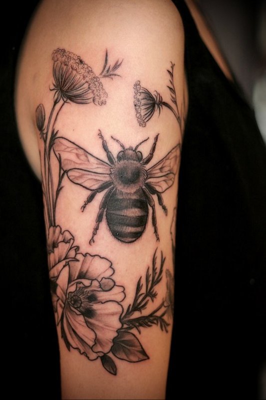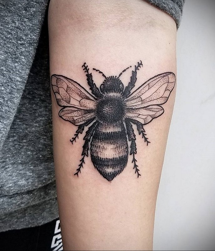- Татуювання, виконані виключно в чорному кольорі - це свого роду демонстрація поваги і любові до цієї неймовірної комахи. Така палітра робить образ бджоли більш органічним і природним. Темні та густі кольори можуть зробити навіть нешкідливу медоносну бджолу загрозливою і в міру жорсткою, що не завжди погано. Бджоли повинні захищати свій вулик, а тому певна форма залякування має право на існування. Забезпечує комахам захист їхнє жало, яке слугує своєрідним попередженням. Це потужний атрибут і символ, на якому можна також можна акцентувати увагу в татуюванні.
