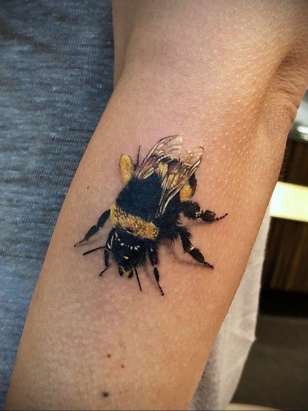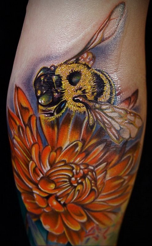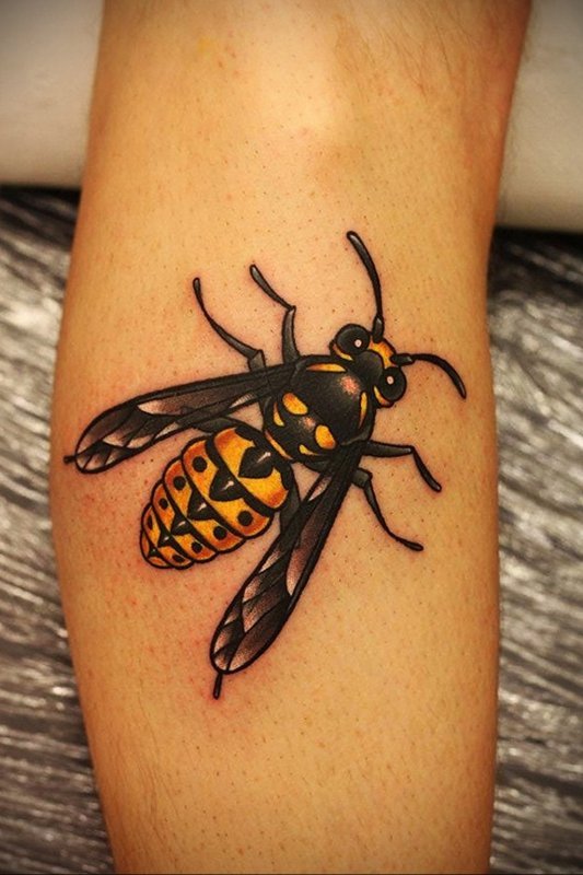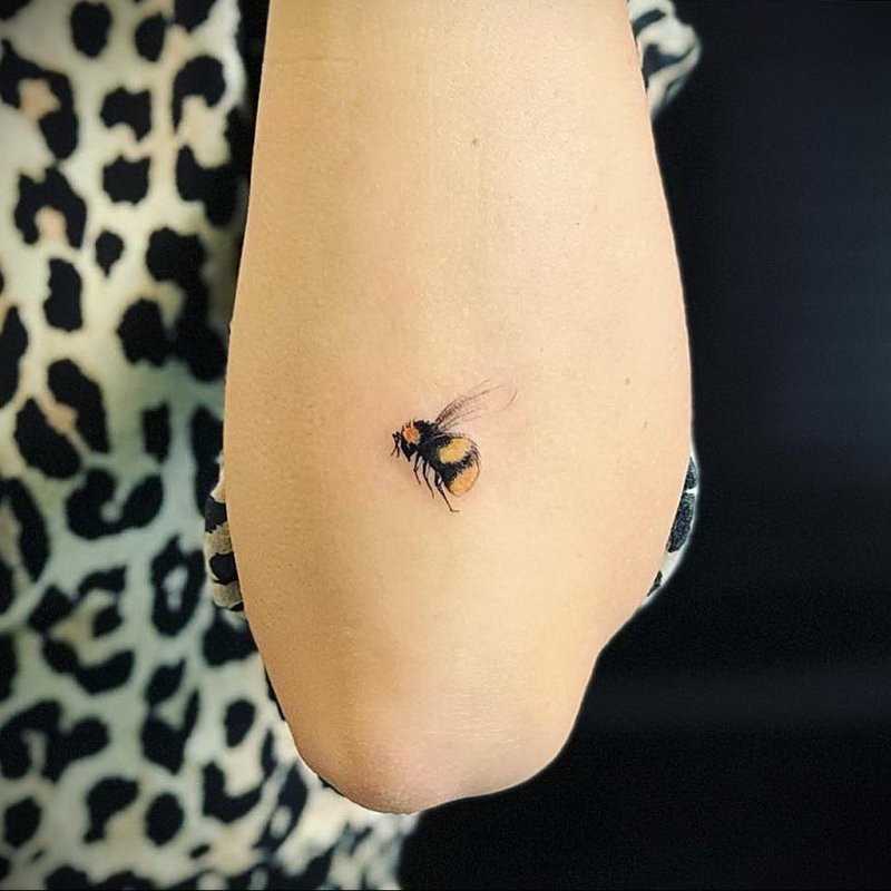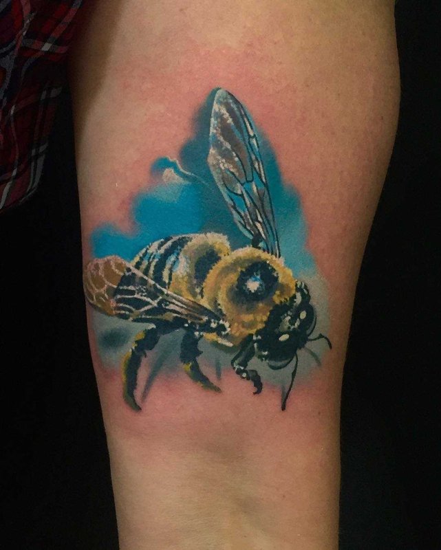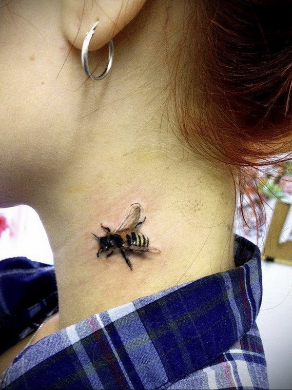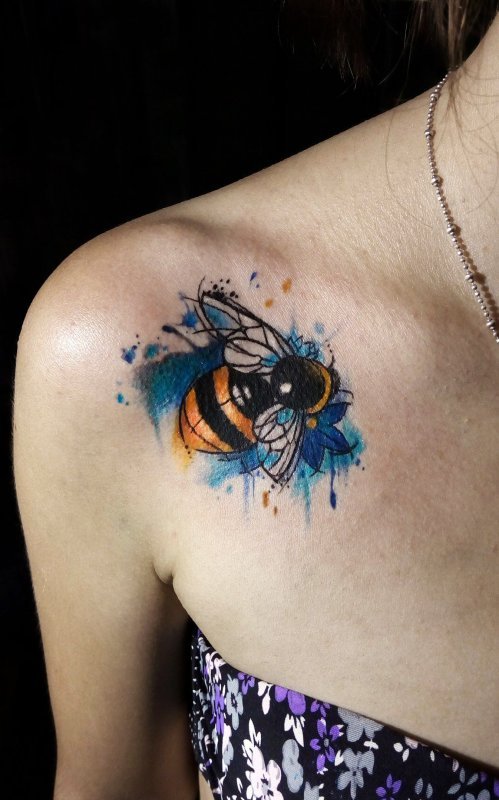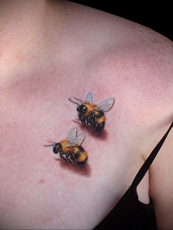 - Різнокольорові татуювання бджіл мають ефектний і вражаючий вигляд, оскільки їхнє природне забарвлення саме по собі досить цікаве. А комбінація чорного і жовтого кольорів - це завжди вдалий вибір.
