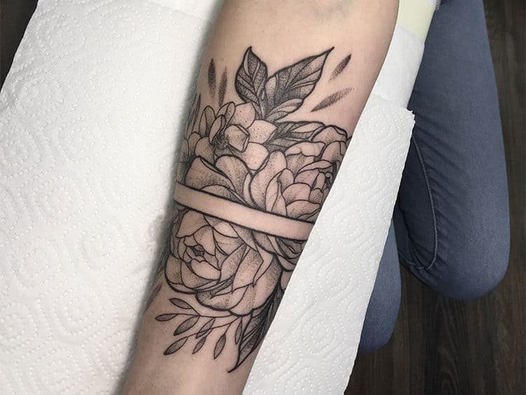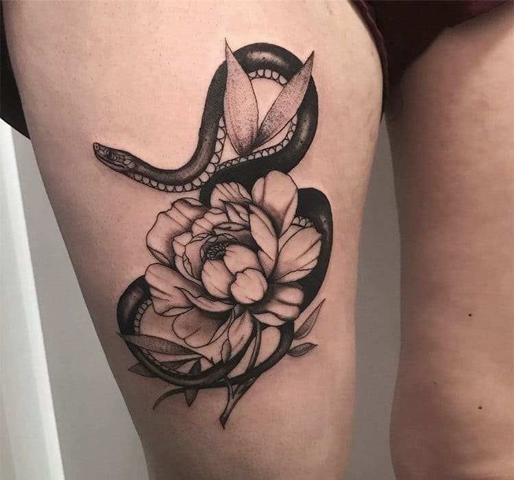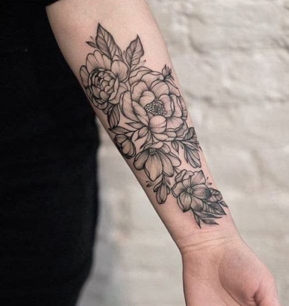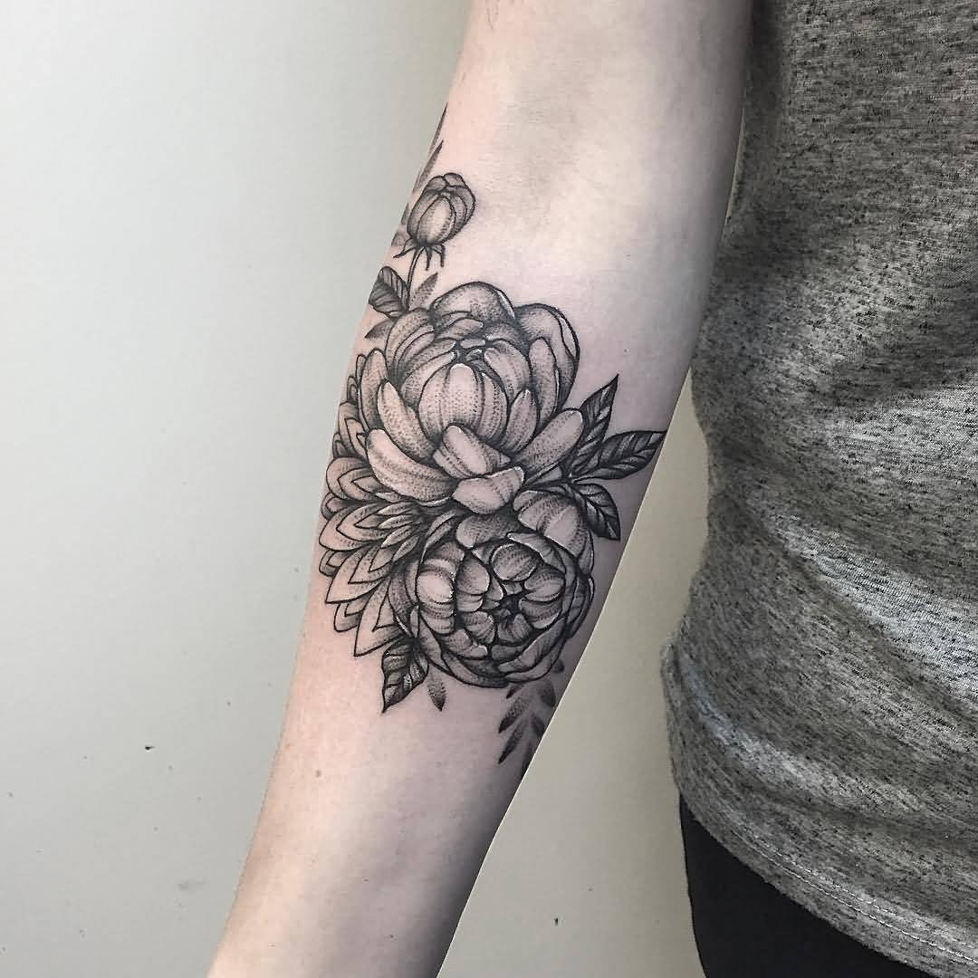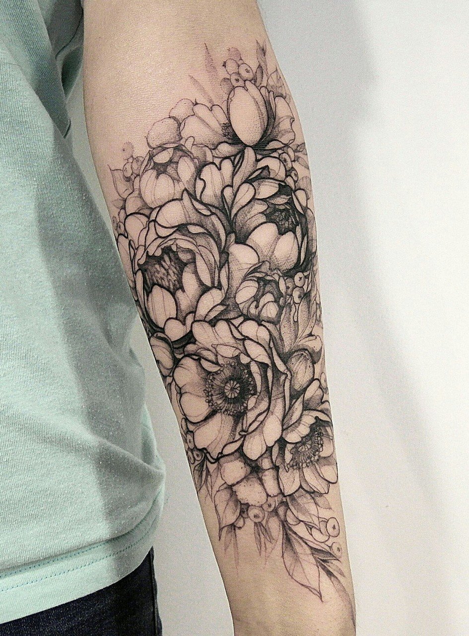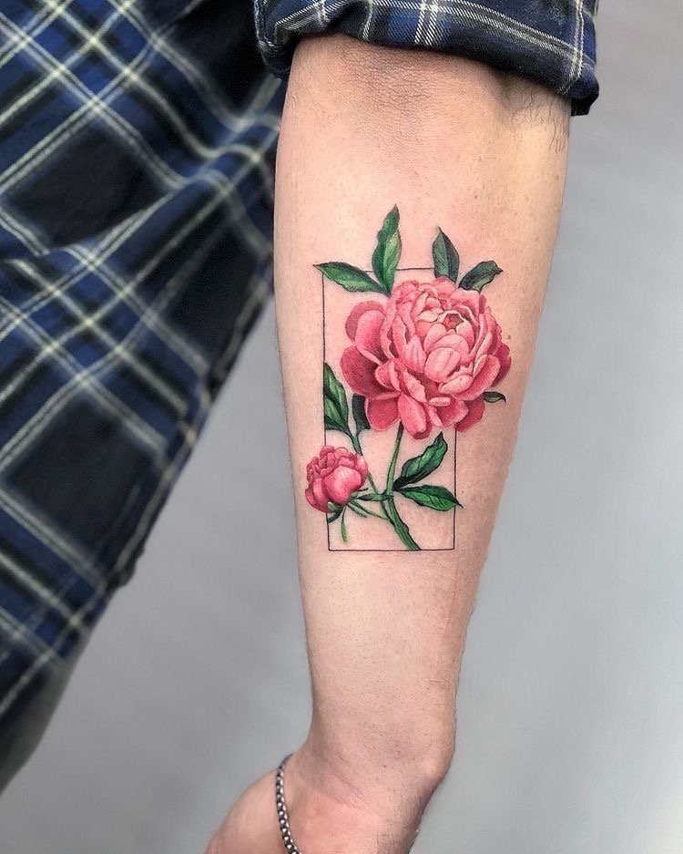 Багато чоловіків так само доповнюють натільні зображення прекрасними квітами, різна лише колірна палітра пігментів. Одним з найбільш популярних ескізів серед тематики квітів, є зображення півонії. Це не тільки прекрасна і пишна квітка, з давніх часів його наділяли особливими силами та значенням. У сфері художнього татуювання півонія так само таїть в собі особливе смислове посилання.